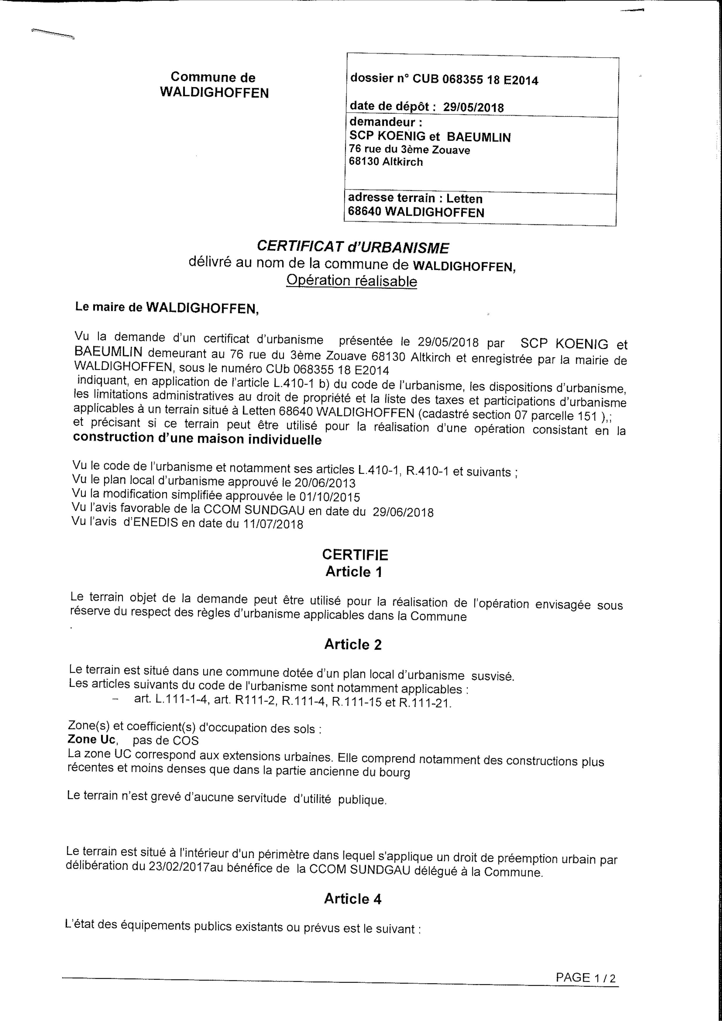 Certificat d'urbanisme opérationnel établi pour la SCP Koenig et Baeumlin, office notarial