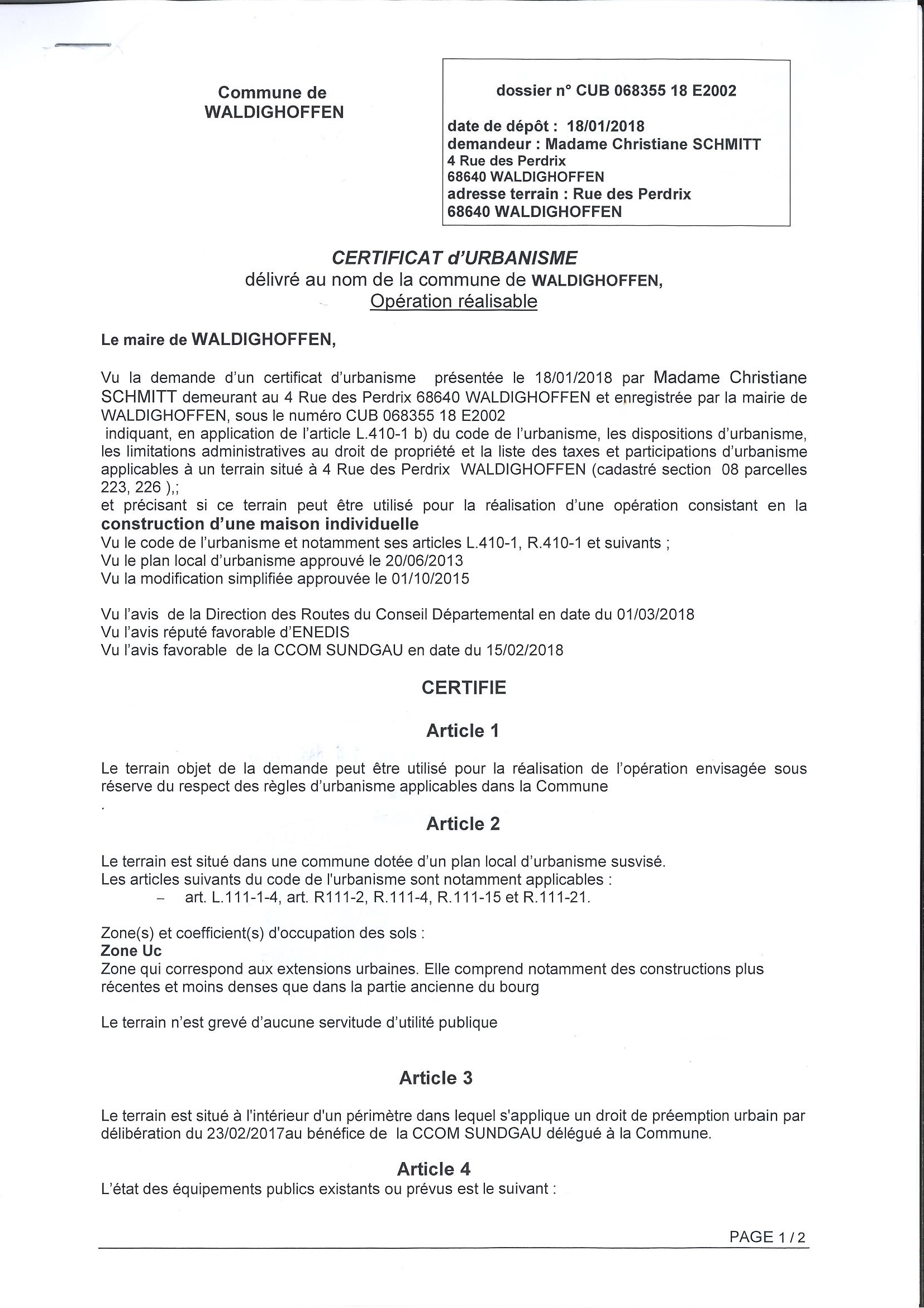 Certificat d'urbanisme opérationnel établi pour Madame Christiane SCHMITT