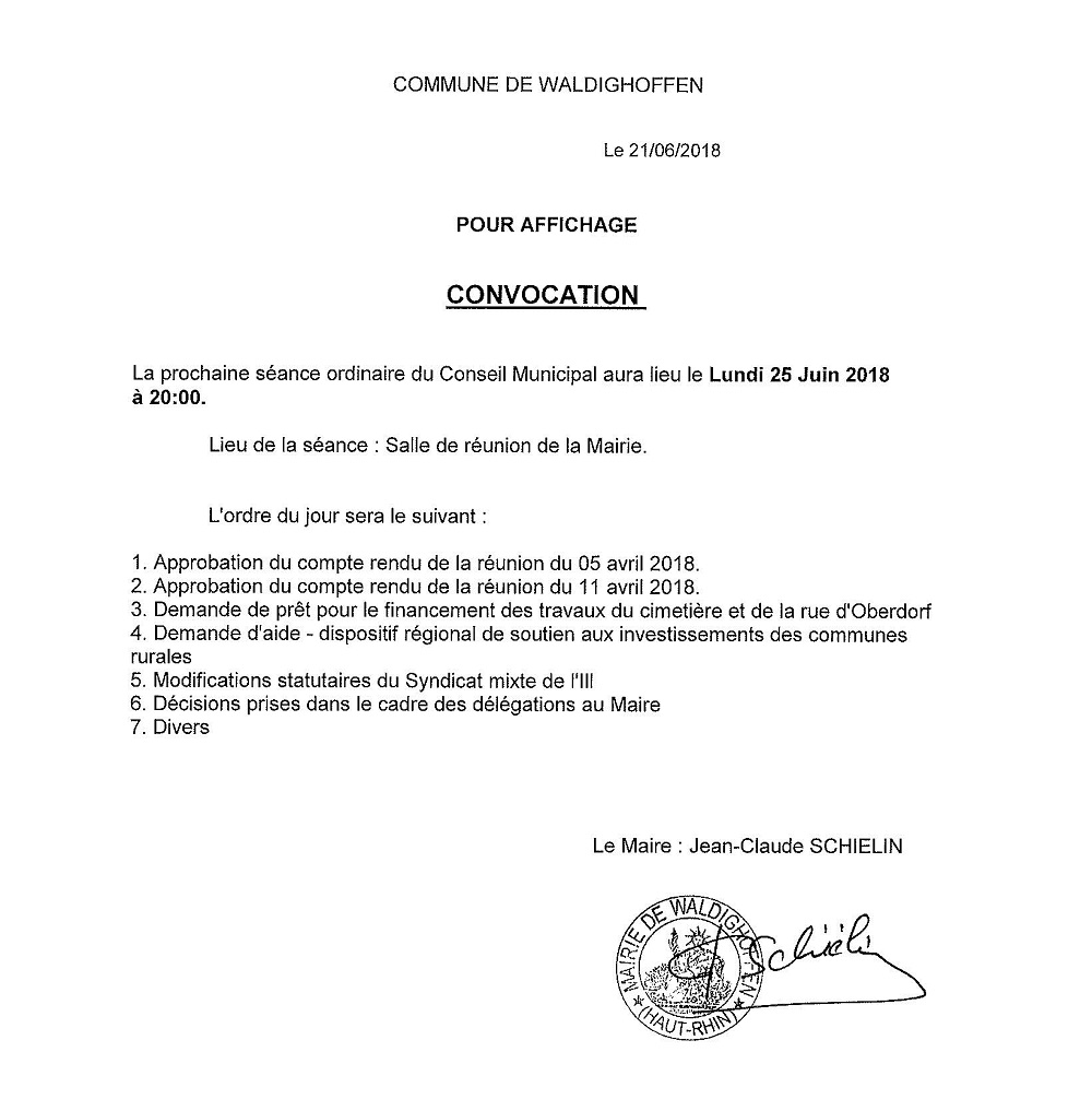 Convocation du conseil municipal de Waldighoffen le 25 juin 2018.