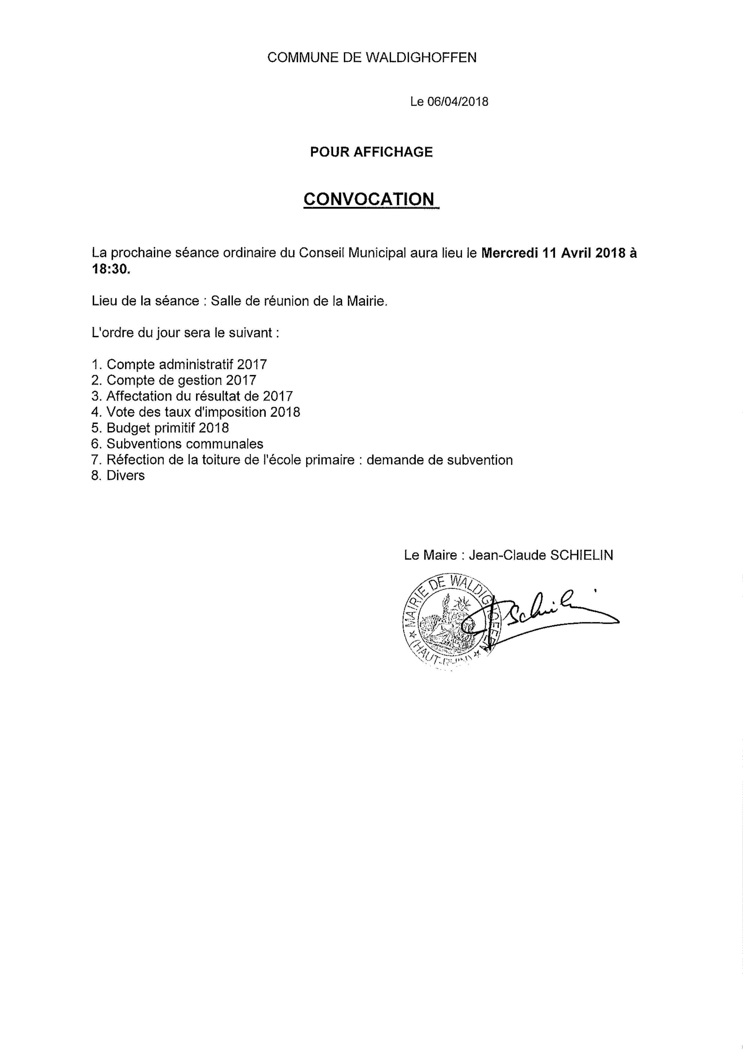 Convocation du Conseil Municipal le mercredi 11 avril 2018
