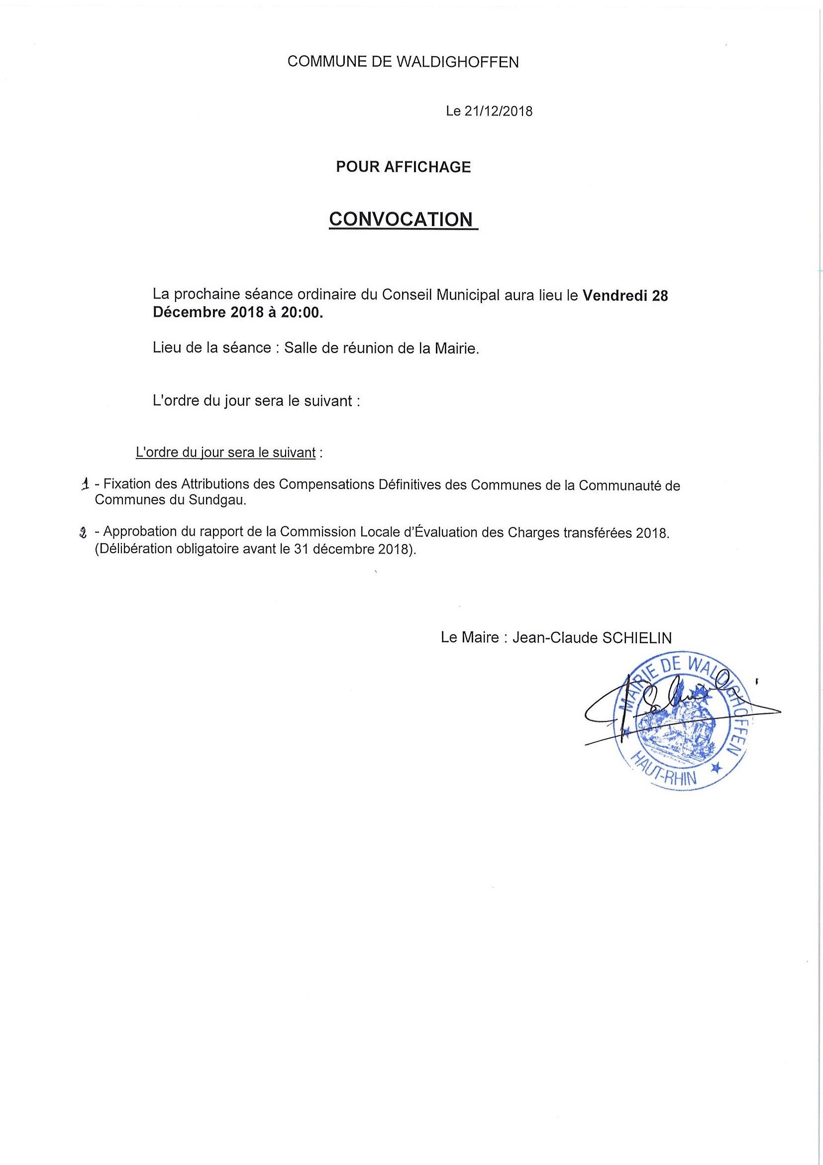 Convocation du Conseil Municipal le vendredi 28 décembre 2018