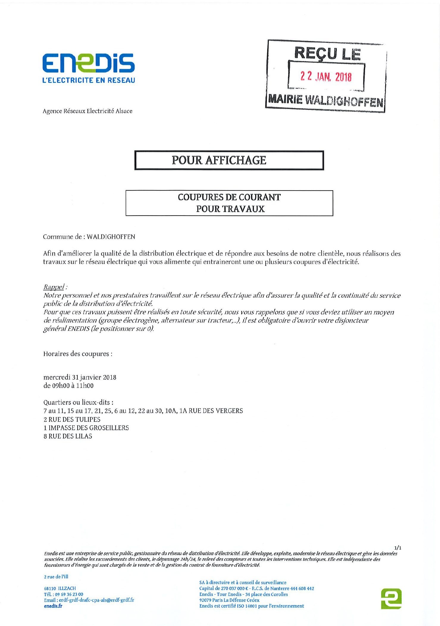 Vous êtes ici : Accueil Mairie Affichage public Annexes affichage public 2018 Coupure de courant le mercredi 31 janvier 2018