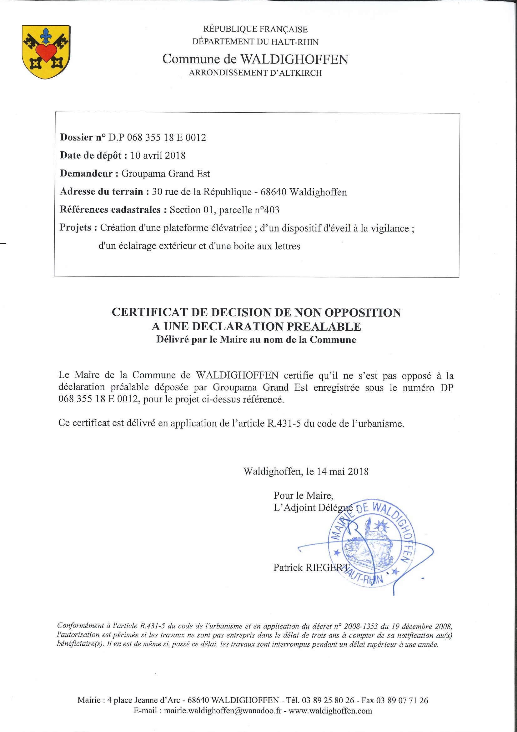 Vous êtes ici : Accueil Mairie Affichage public Annexes affichage public 2018 Décision à la déclaration préalable de Groupama Grand Est