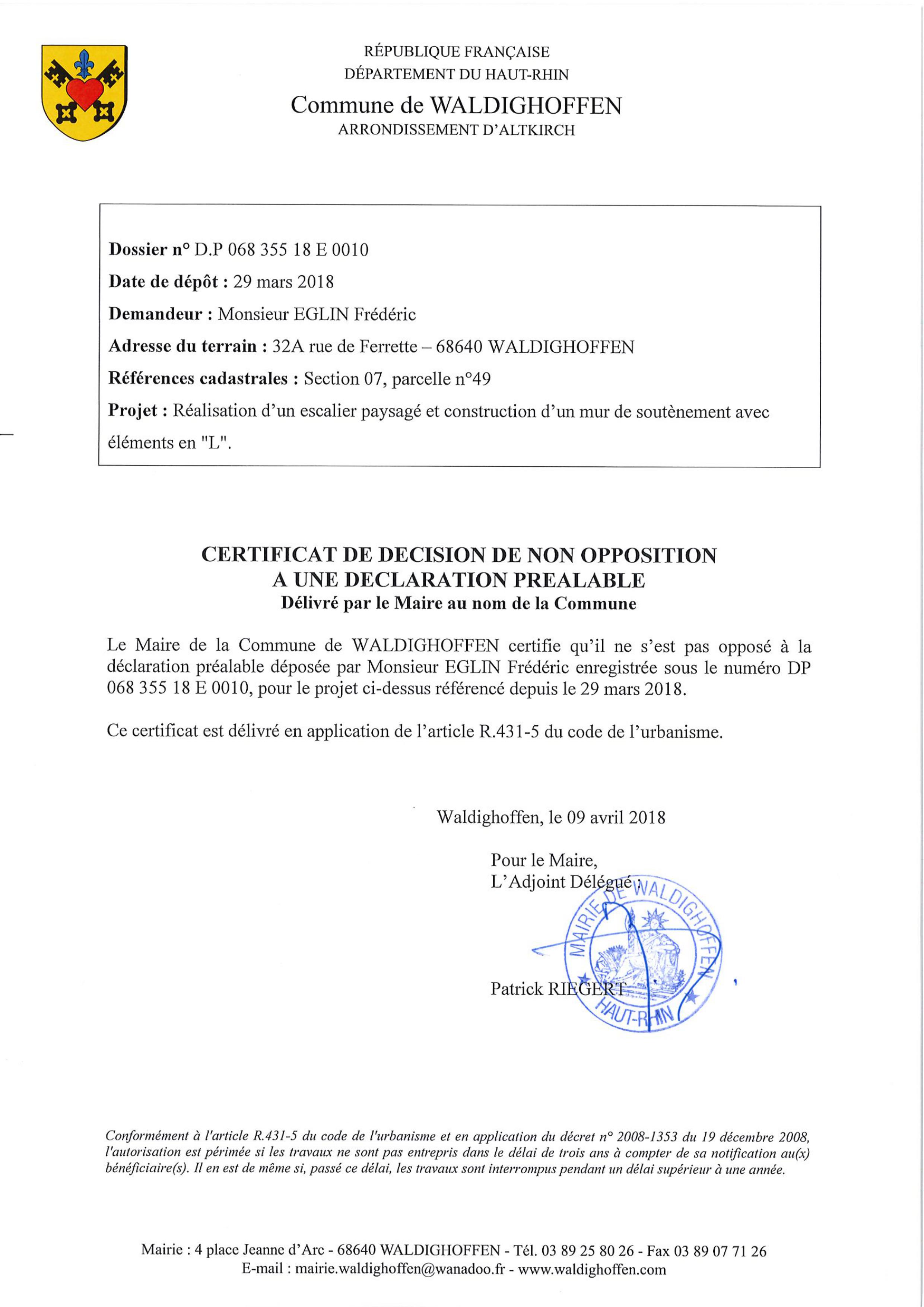 Avis de non opposition à la déclaration préalable déposée par Monsieur EGLIN Frédéric