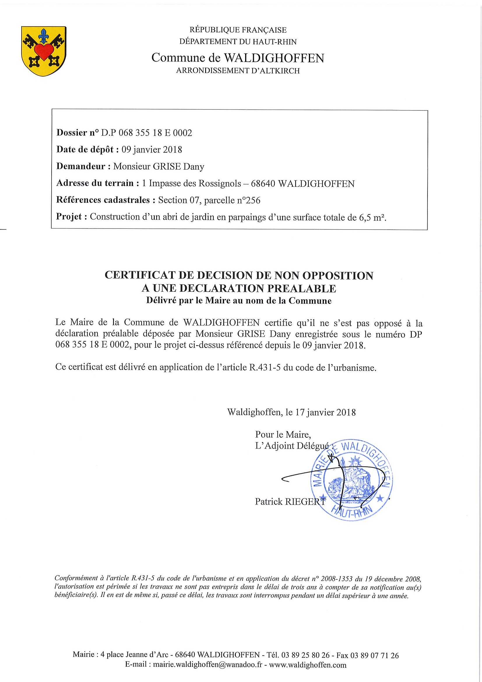 Vous êtes ici : Accueil Mairie Affichage public Annexes affichage public 2018 Décision à la déclaration préalable de M. GRISE Dany