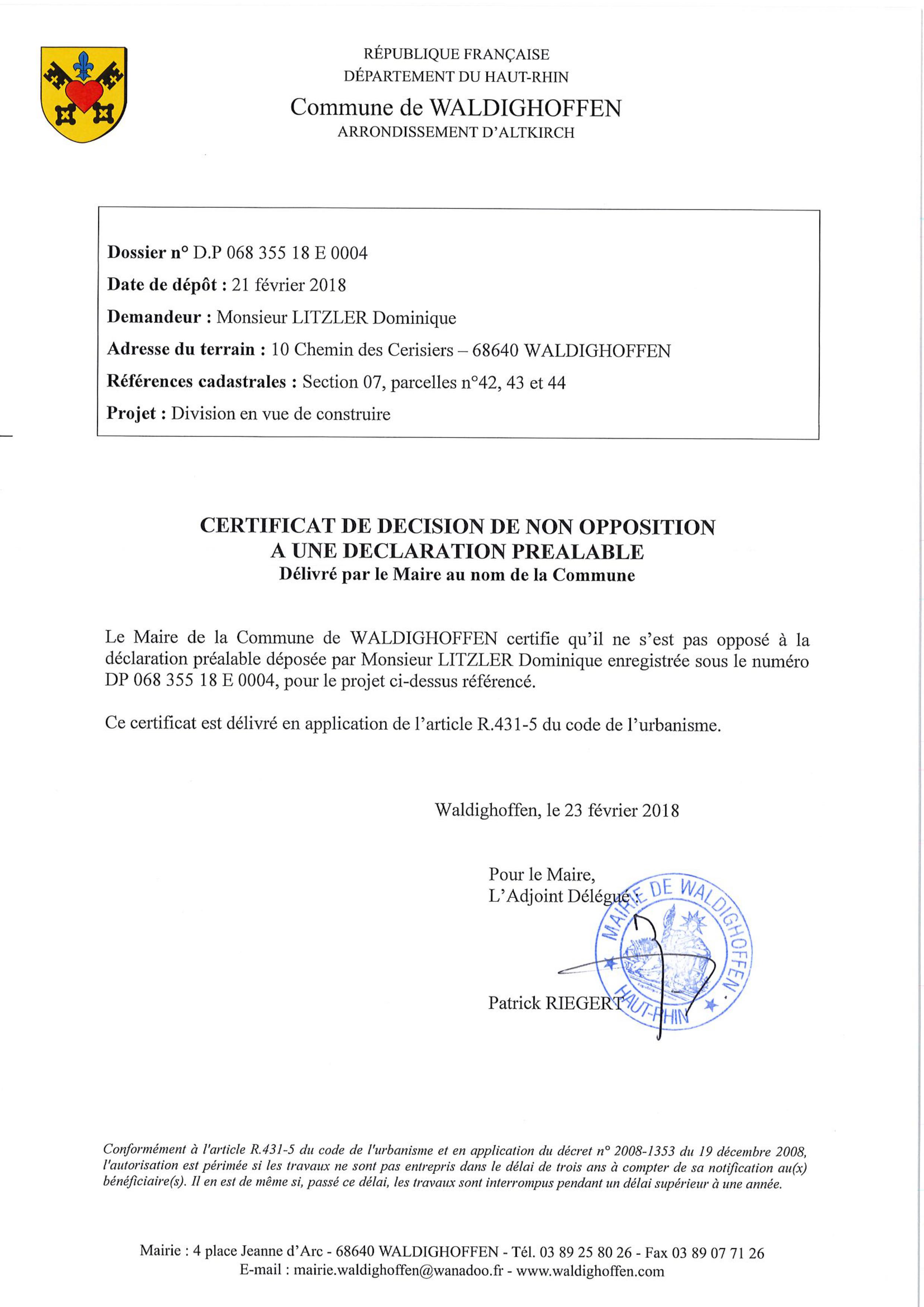 Avis de non opposition à la déclaration préalable déposée par Monsieur LITZLER Dominique
