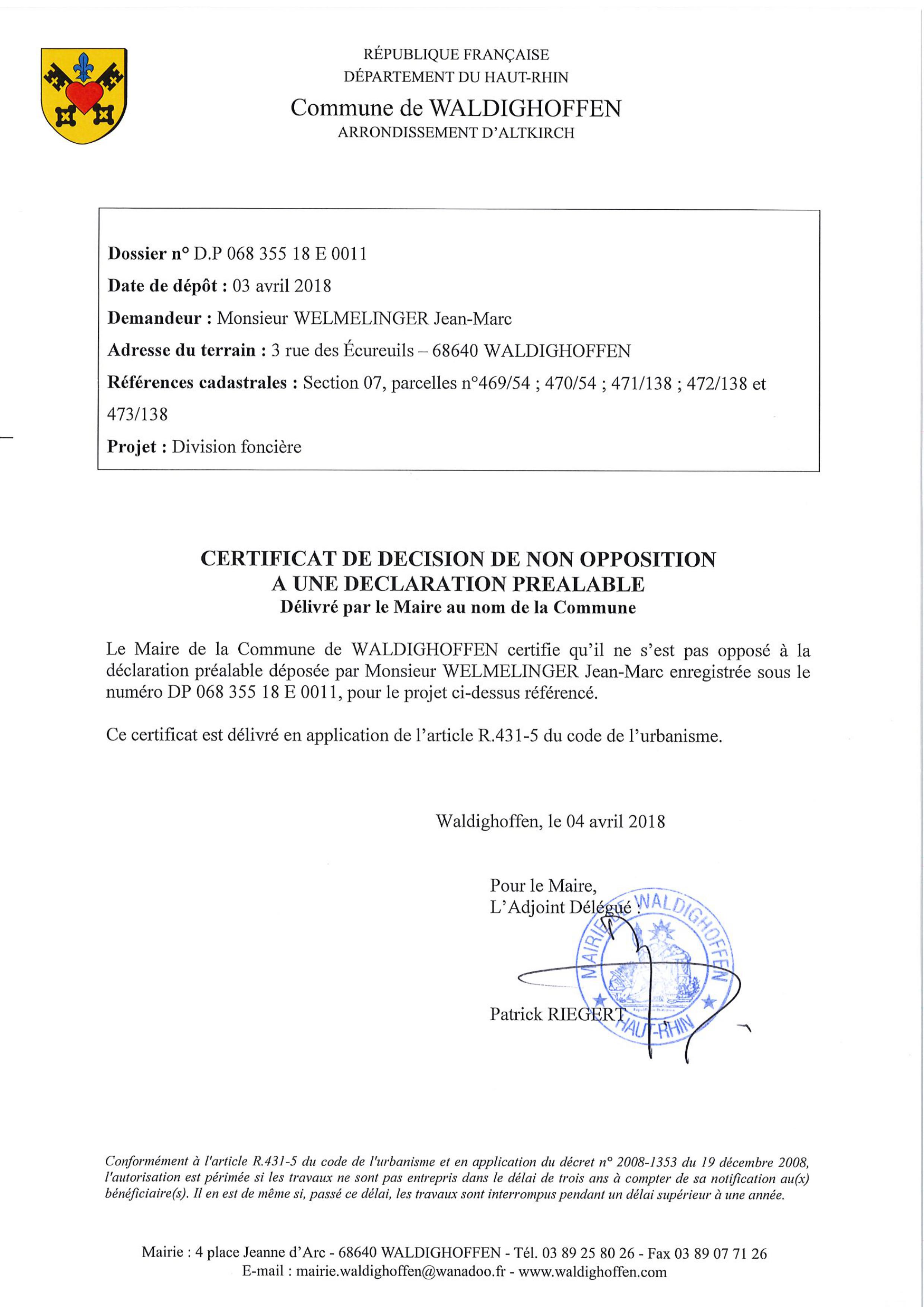 Décision à la déclaration préalable de M. WELMELINGER Jean-Marc