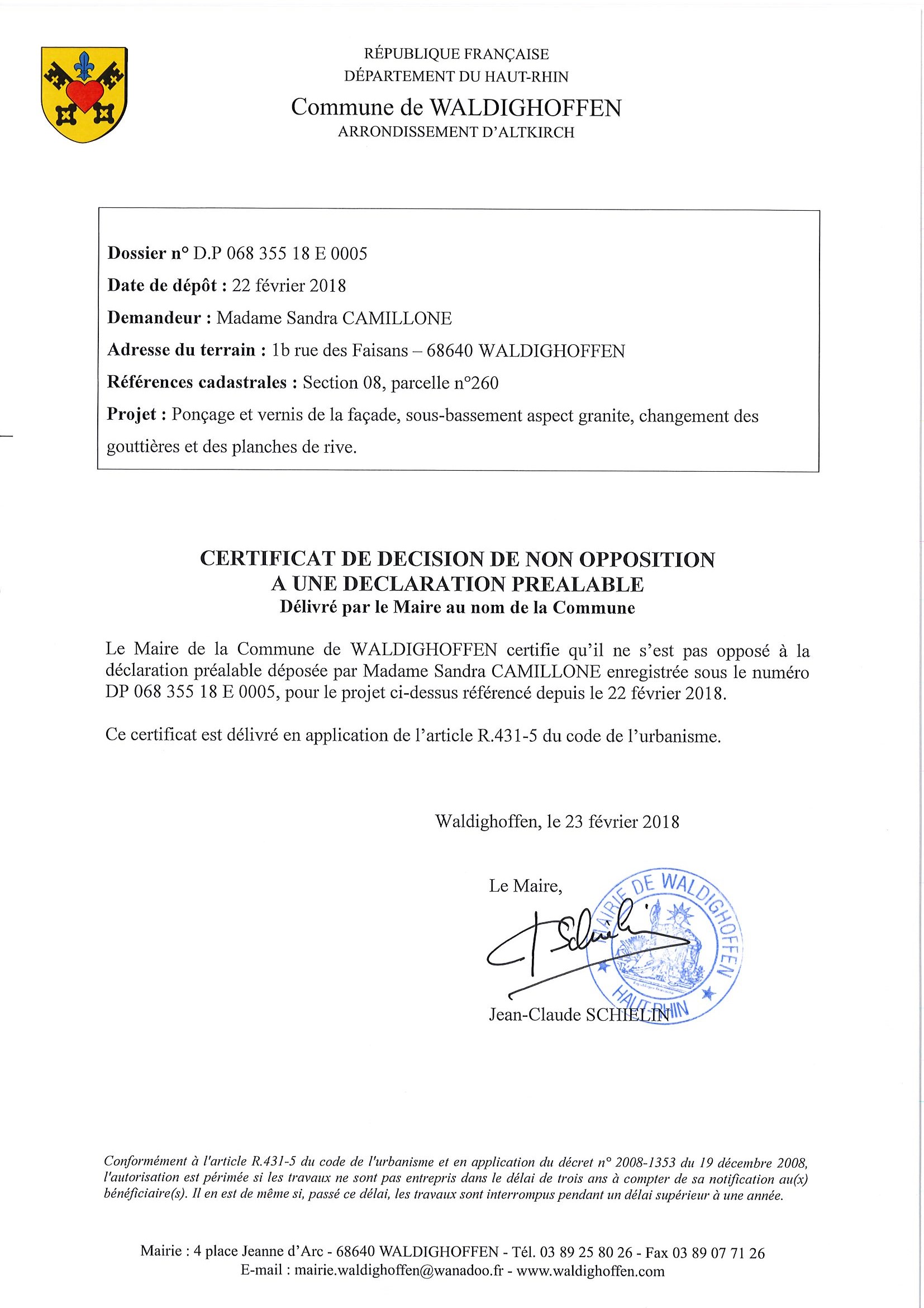 Vous êtes ici : Accueil Mairie Affichage public Annexes affichage public 2018 Décision à la déclaration préalable de Mme CAMILLONE Sandra