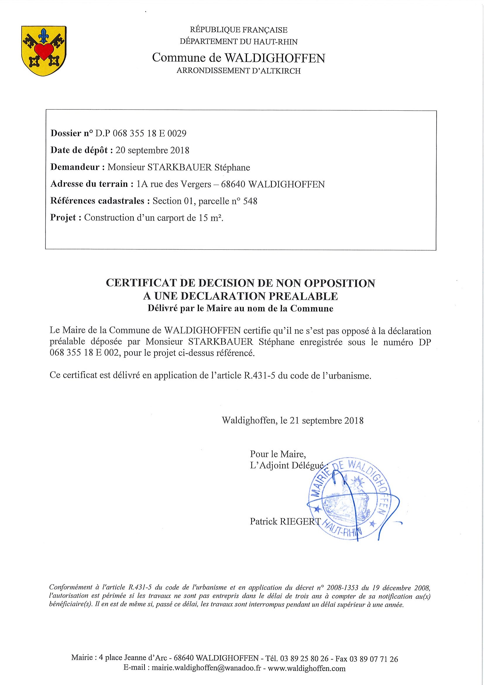 Certificat de non opposition délivré à Monsieur Starkbauer Stéphane pour la construction d'un carport