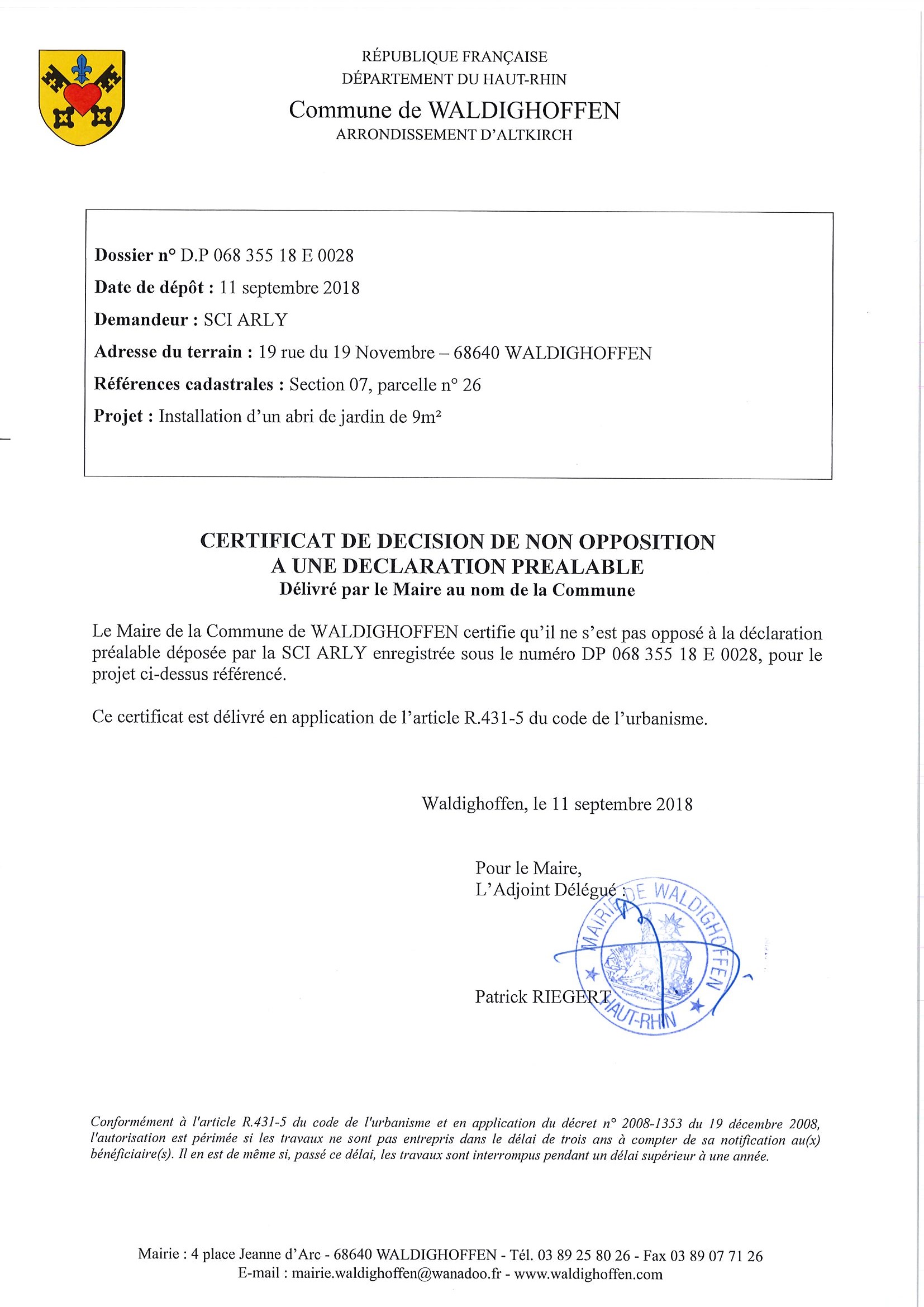 Certificat de non opposition délivré à la Sci Arly pour l'installation d'un abri de jardin