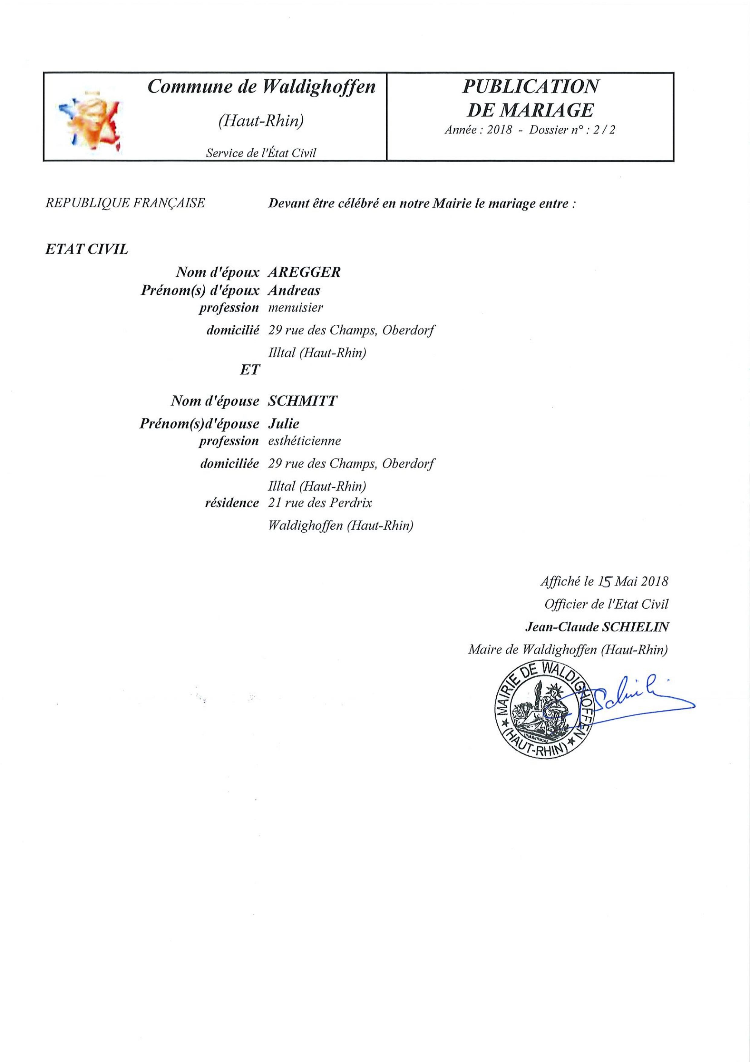 Publication de mariage entre M. AREGGER Andreas et Mme SCHMITT Julie