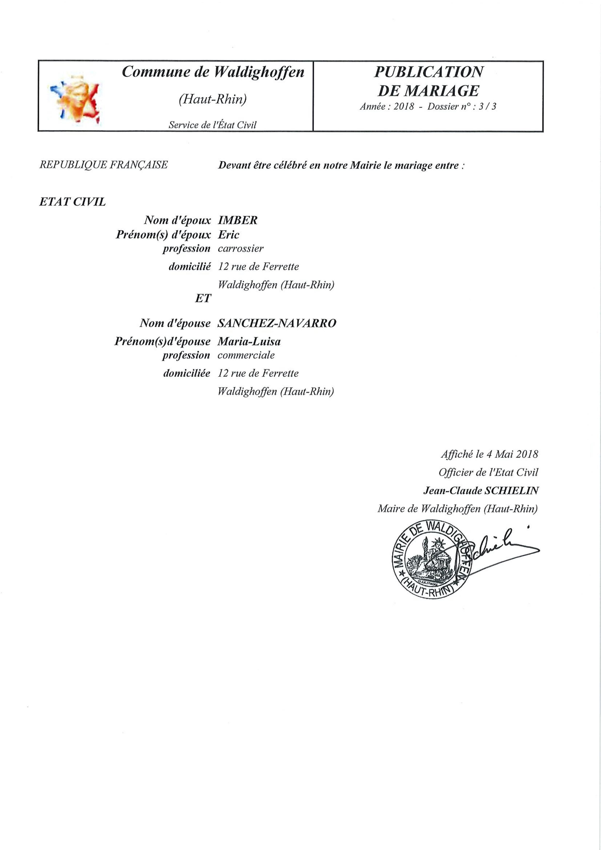 Publication de mariage entre M. IMBER et Mme SANCHEZ-NAVARRO Maria-Luisa