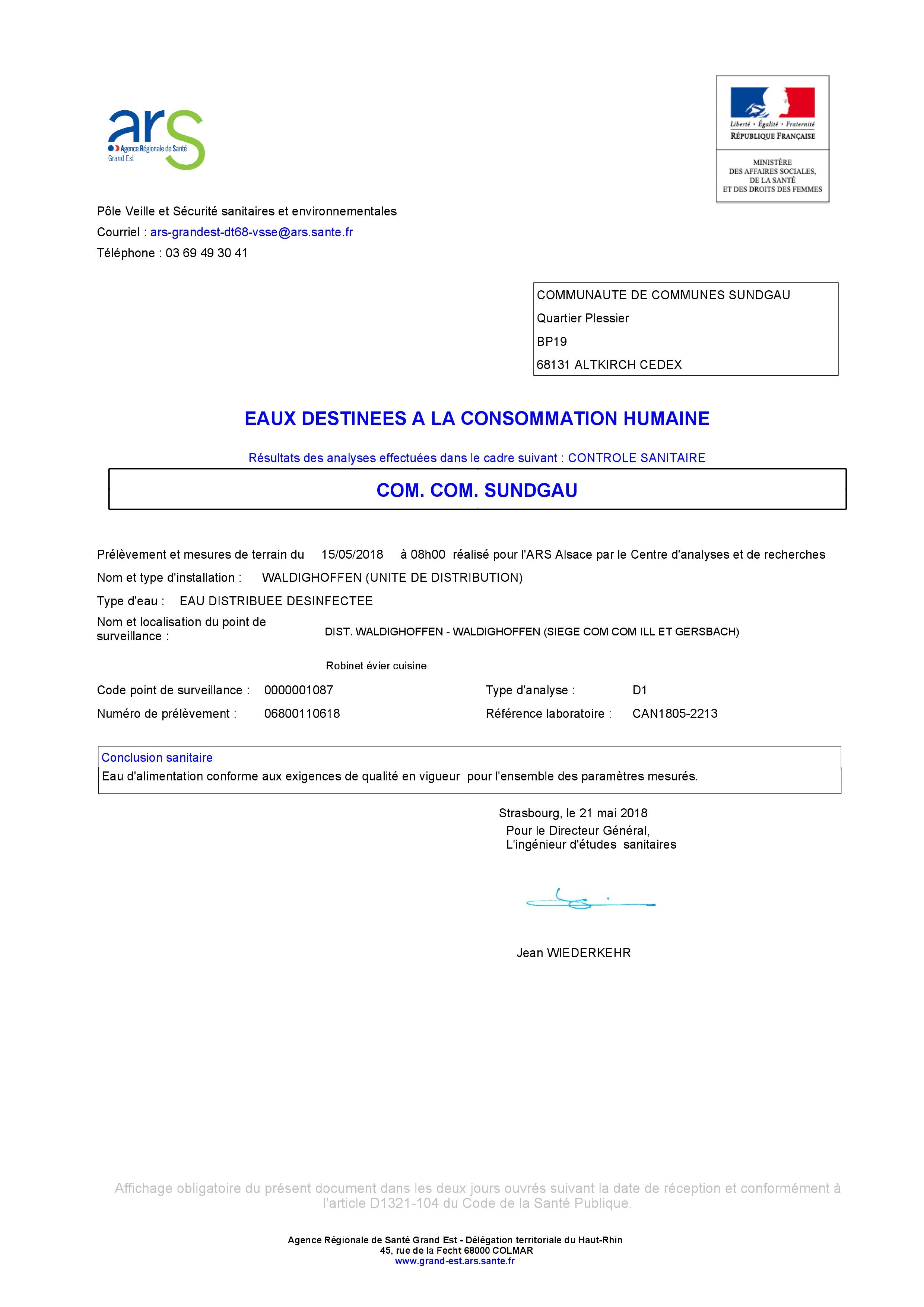 Copie du rapport d'analyse de l'eau potable de Waldighoffen. Prélèvement n°06800110618 effectué le 15 mai 2018
