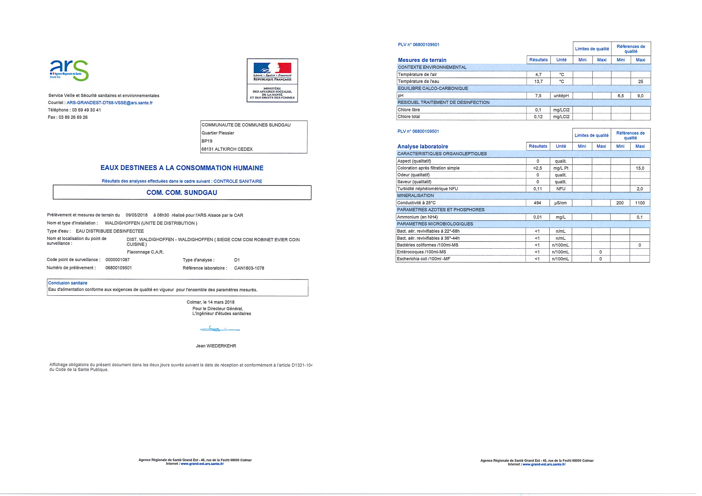 Copie des rapports d'analyse de l'eau potable de Waldighoffen. Prélèvements n°06800109501 et n°06800109507 effectués le 14 mars 2018