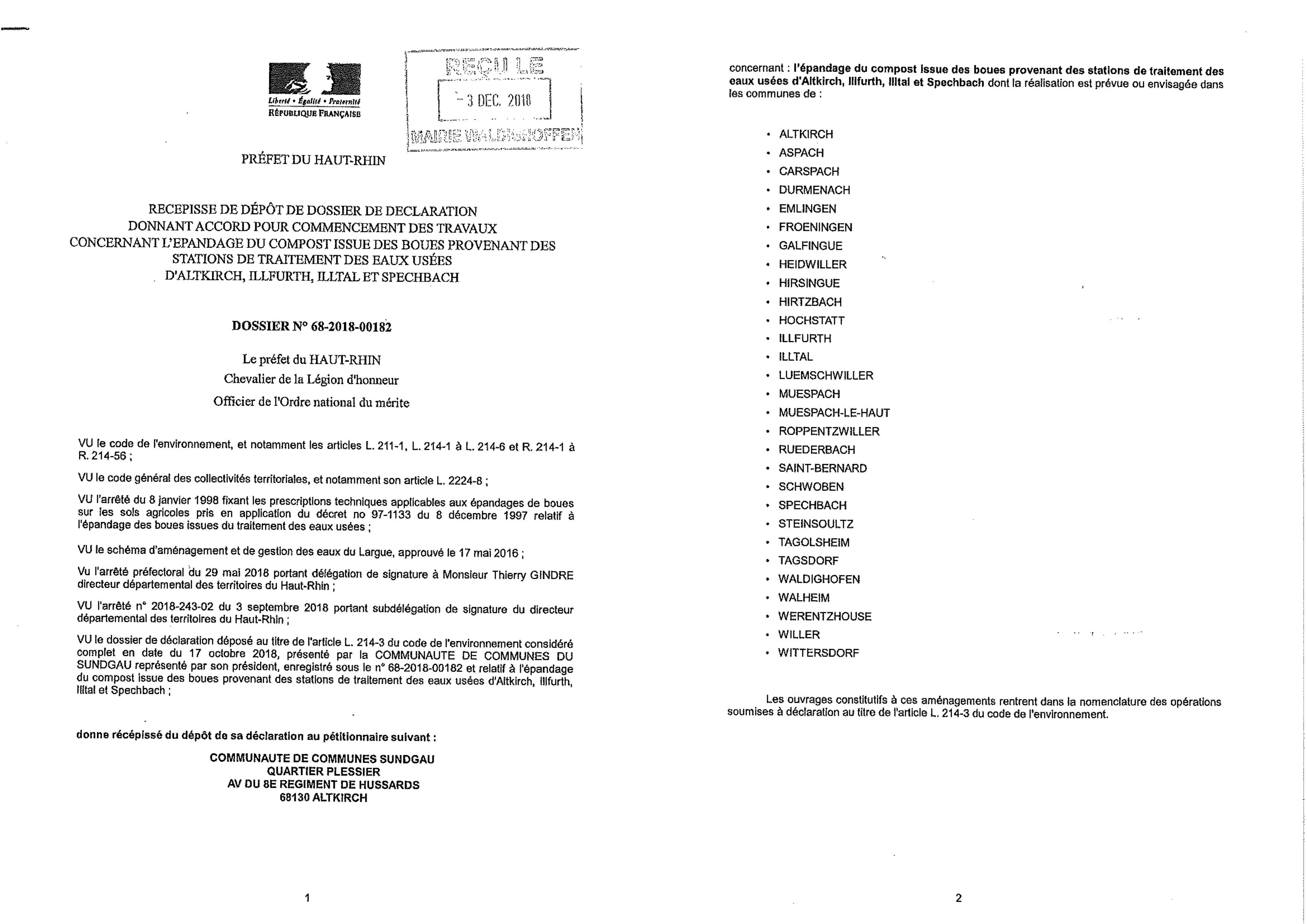 Récépissé d'un dépôt de déclaration de travaux par la Communauté de Communes du Sundgau