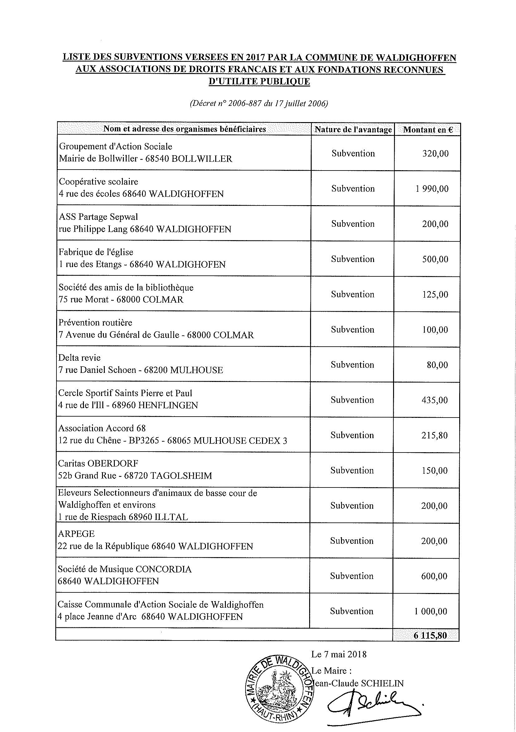 Liste des subventions versées par la Commune aux associations et aux fondations dans l'année 2017