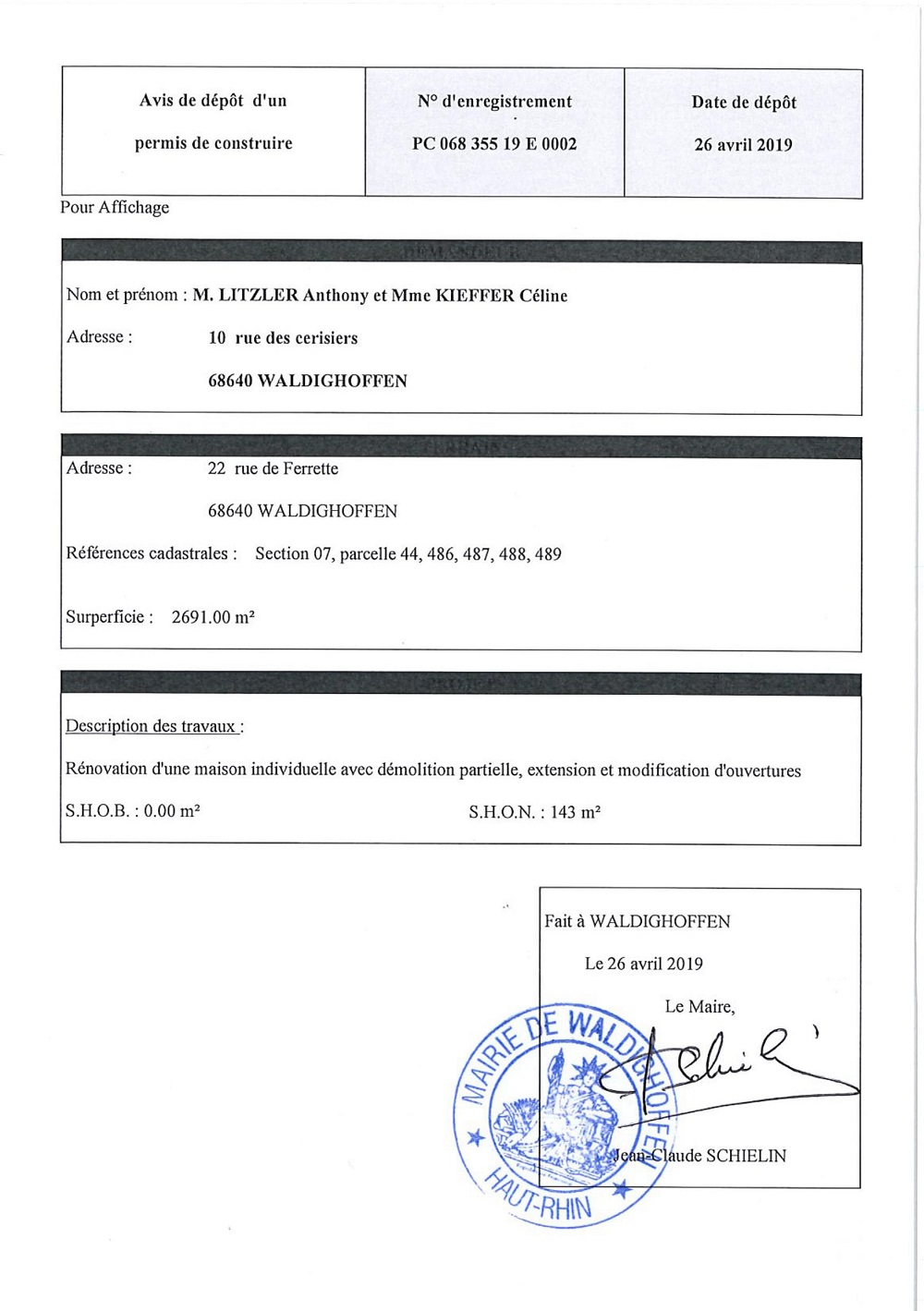 Vous êtes ici : Accueil Mairie Affichage public Annexes affichage public 2019 Dépôt PC 19E0002 LITZLER KIEFFER