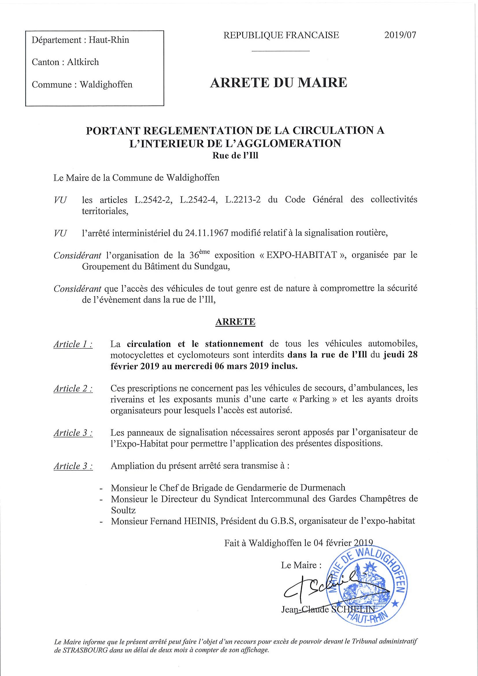 Arrêté du Maire réglementant la circulation dans la rue de l'Ill à l'occasion de l'expo-habitat
