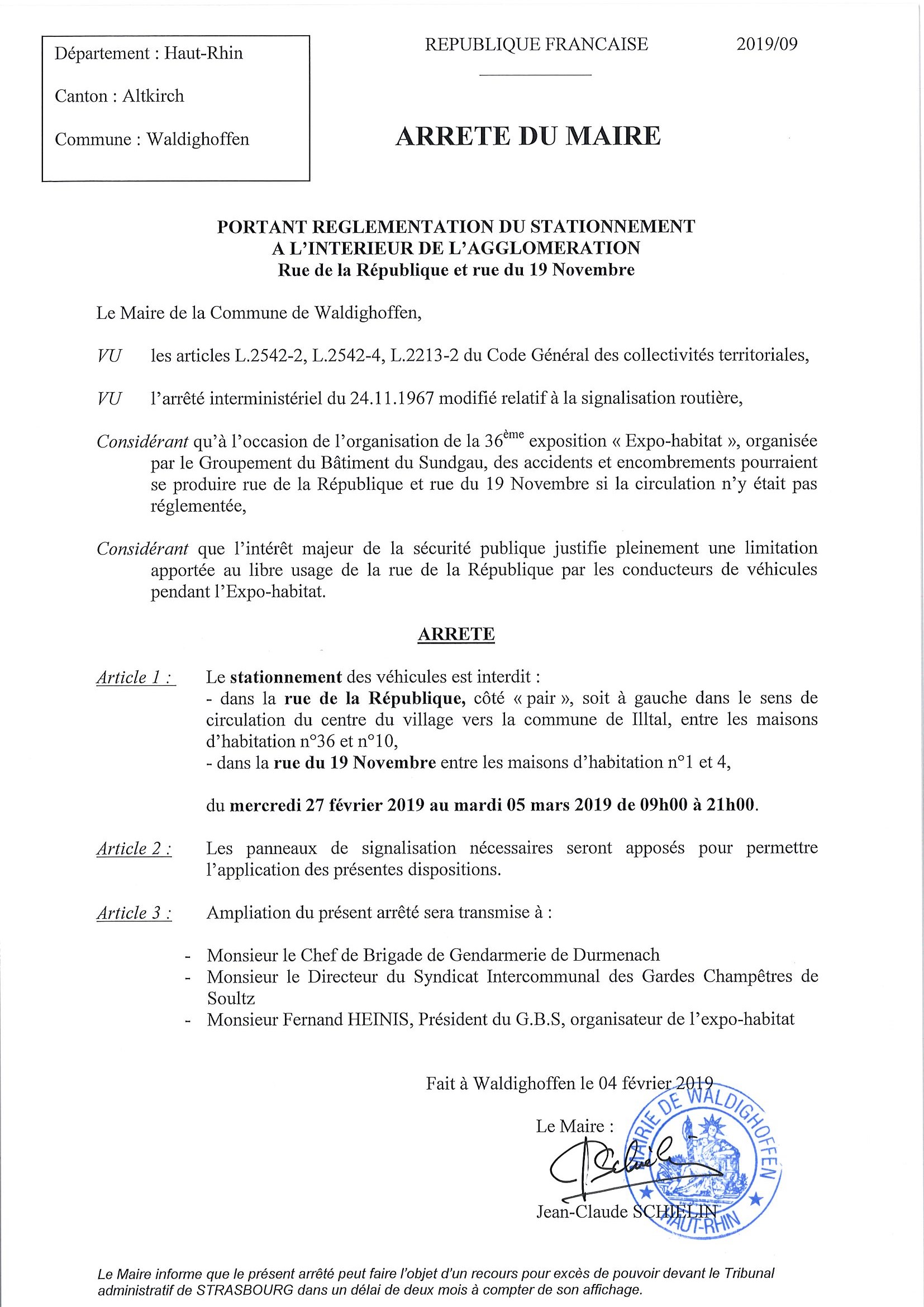 Arrêté du Maire réglementant le stationnement dans la rue de la République et la rue du 19 Novembre à l'occasion de l'expo-habitat