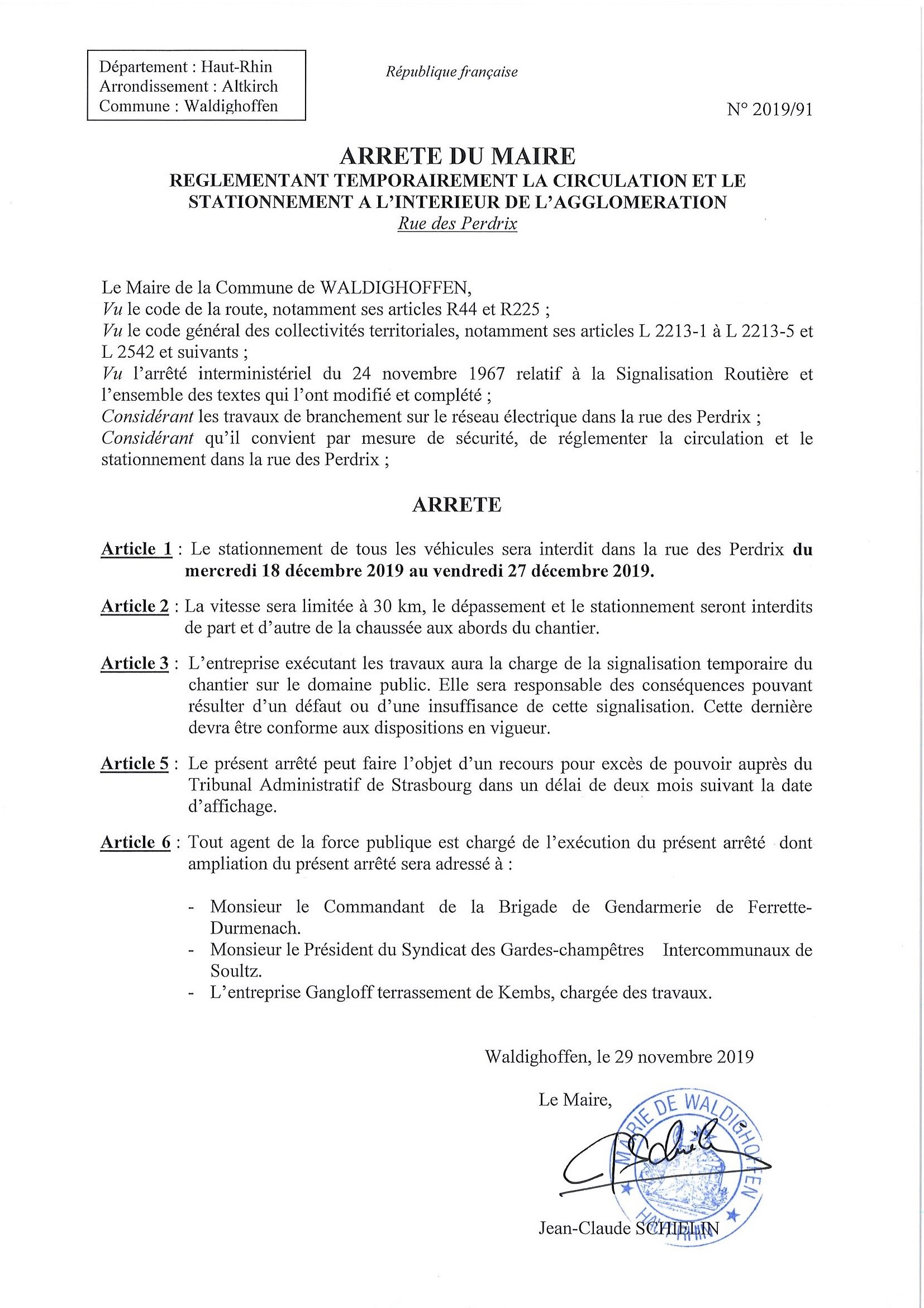Arrêté réglementant la circulation et le stationnement - rue des Perdrix
