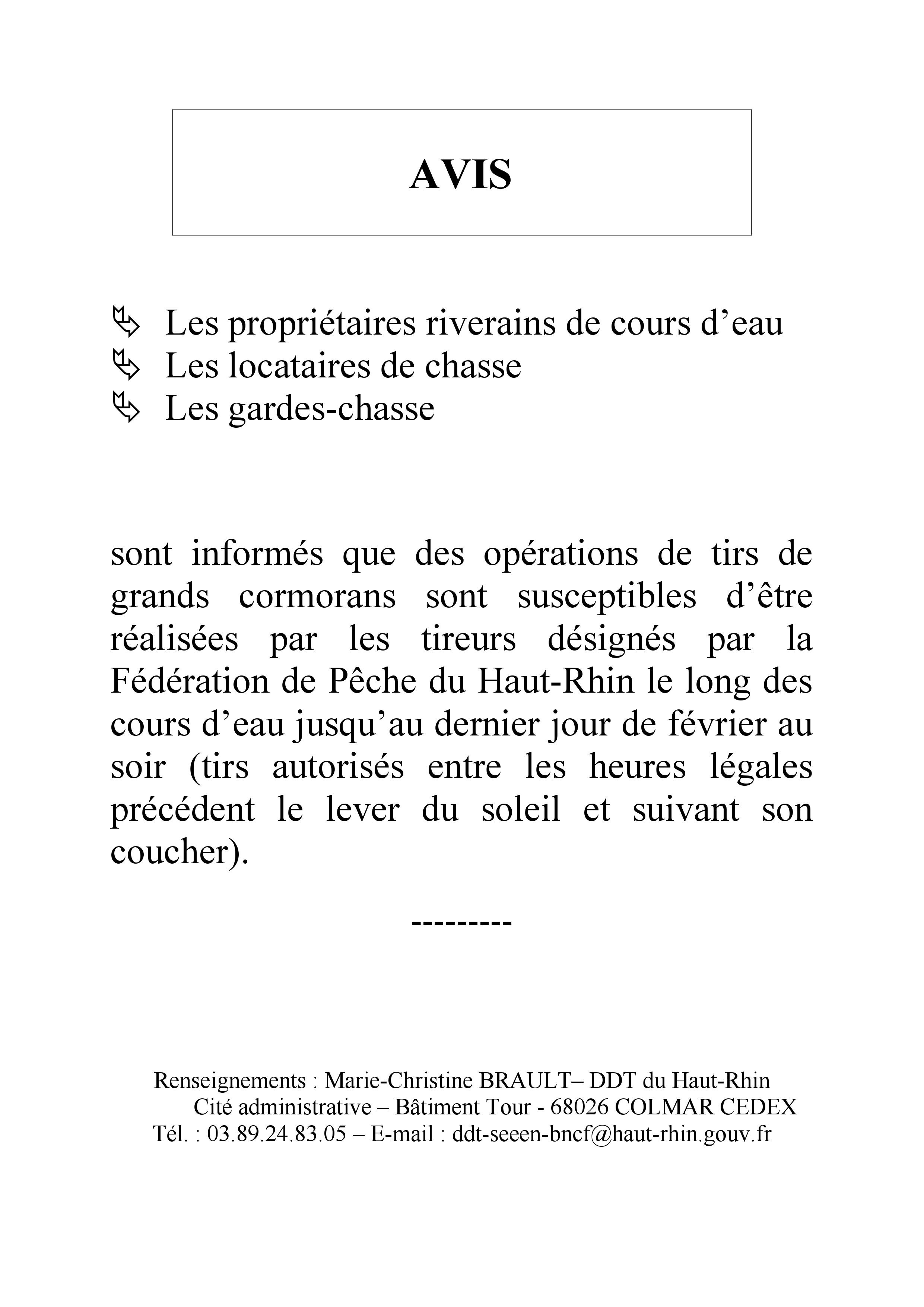 La Fédération de Pêche du Haut-Rhin informe les propriétaires riverains de cours d'eau, les locataires de chasse et les garde-chasses, de tirs de grands cormorans possibles jusqu'au 29 février 2020.
