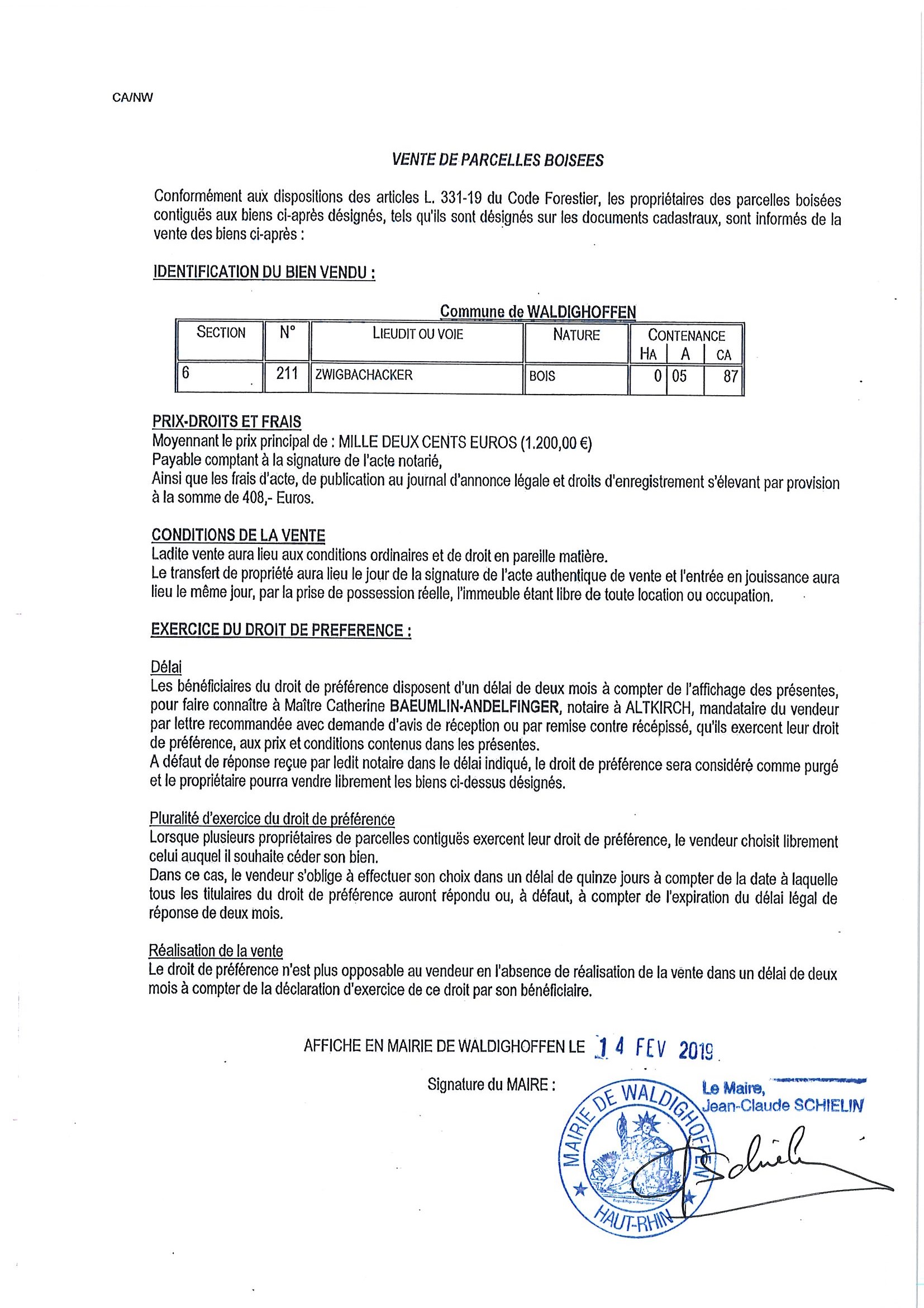 Vous êtes ici : Accueil Mairie Affichage public Annexes affichage public 2019 Avis de vente de parcelles boisées