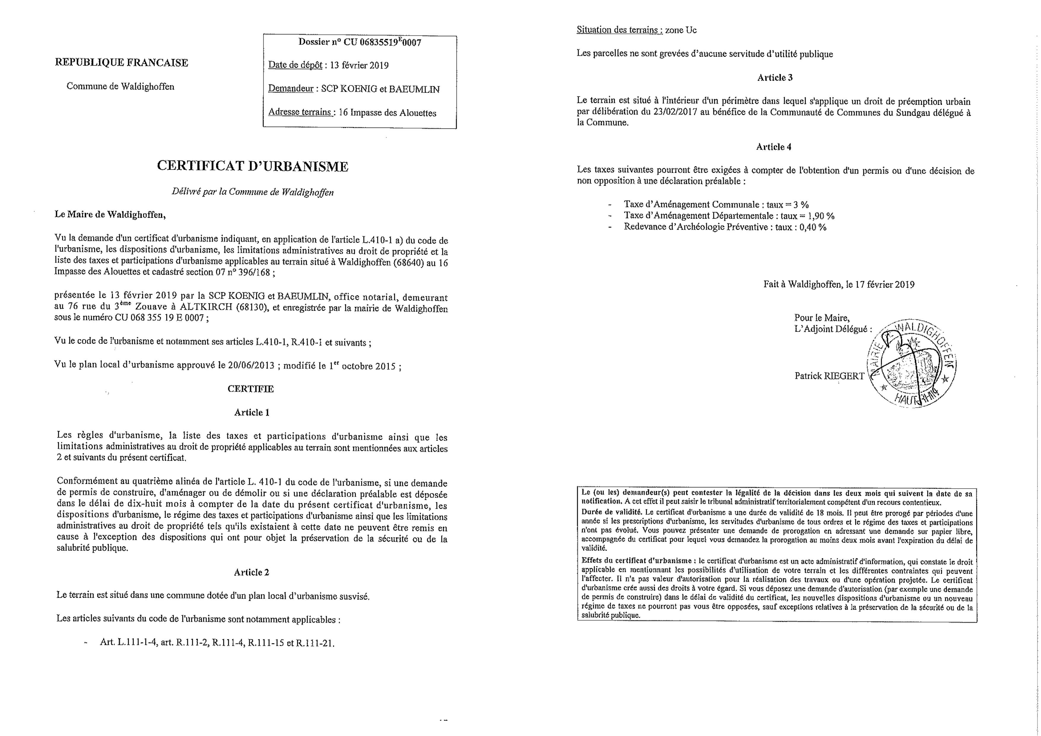 Certificat d'urbanisme établi pour la Scp Koenig et Baeumlin, office notarial