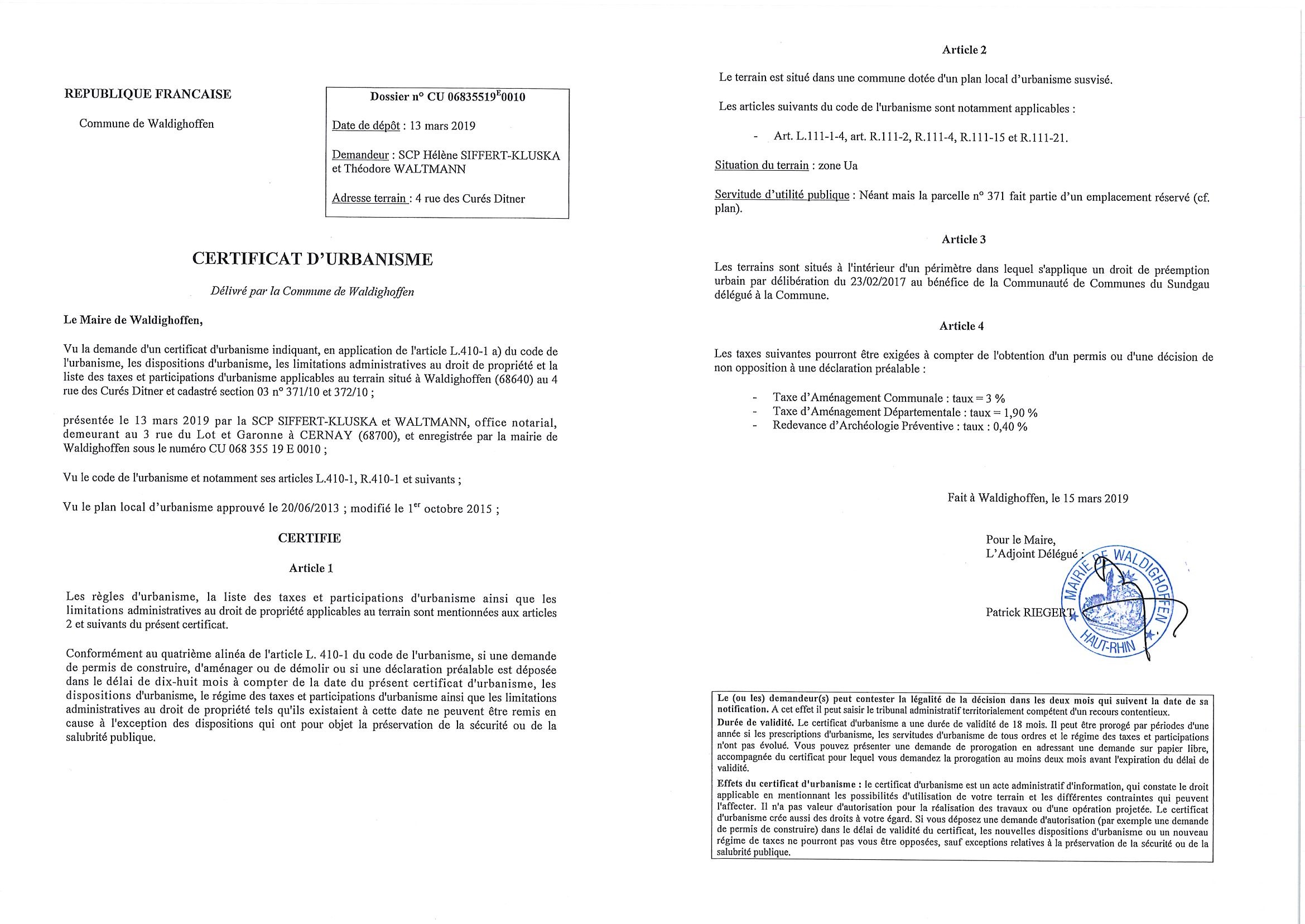 Certificat d'urbanisme établi pour la Scp Siffert-Kluska et Waltmann
