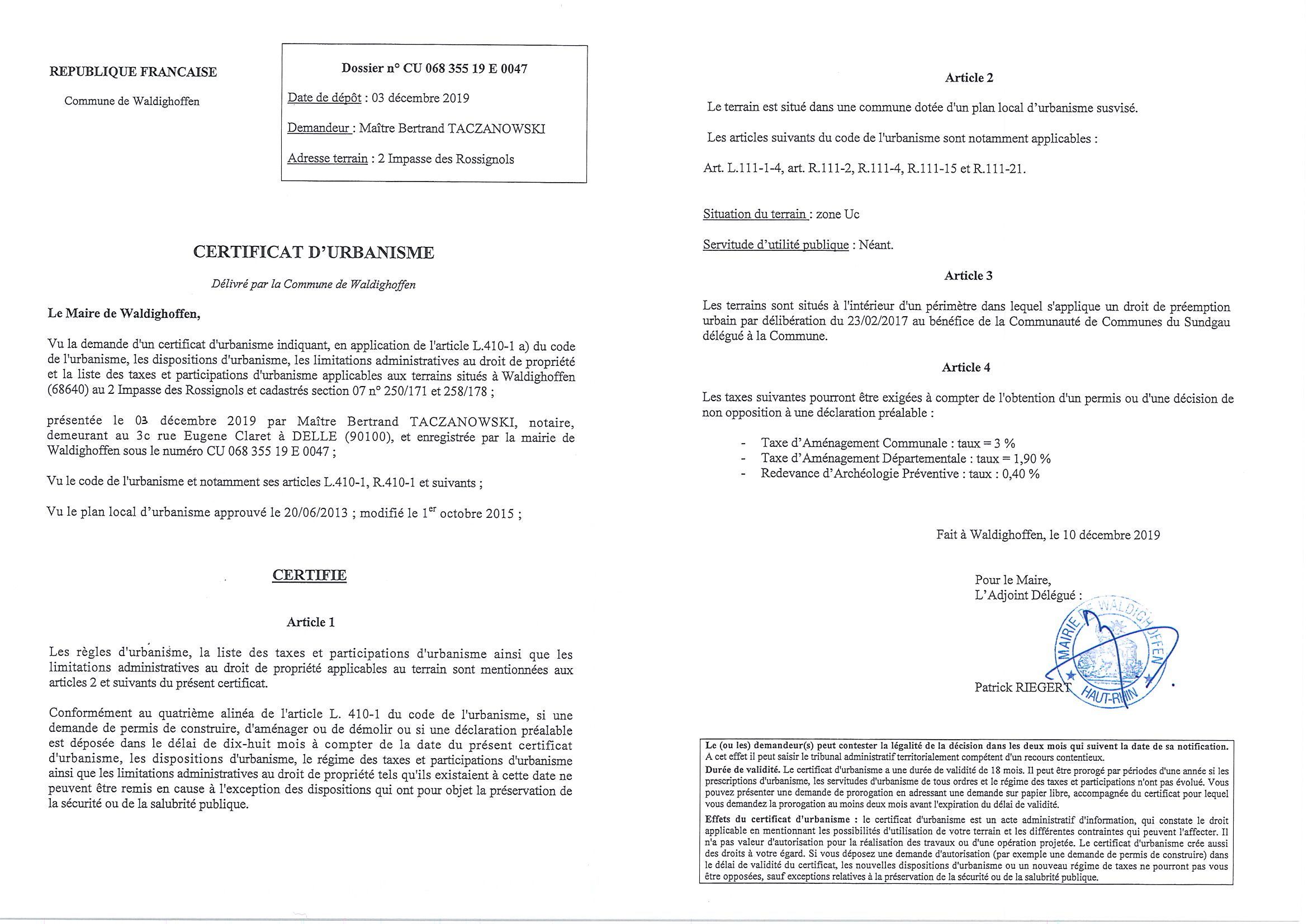 Certificat d'urbanisme établi pour Maître Bertrand Taczanowski