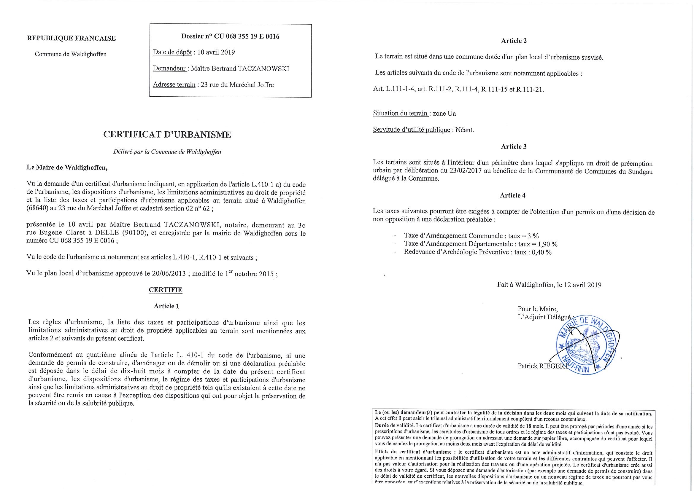 Certificat d'urbanisme établi pour Maître Bertrand Taczanowski