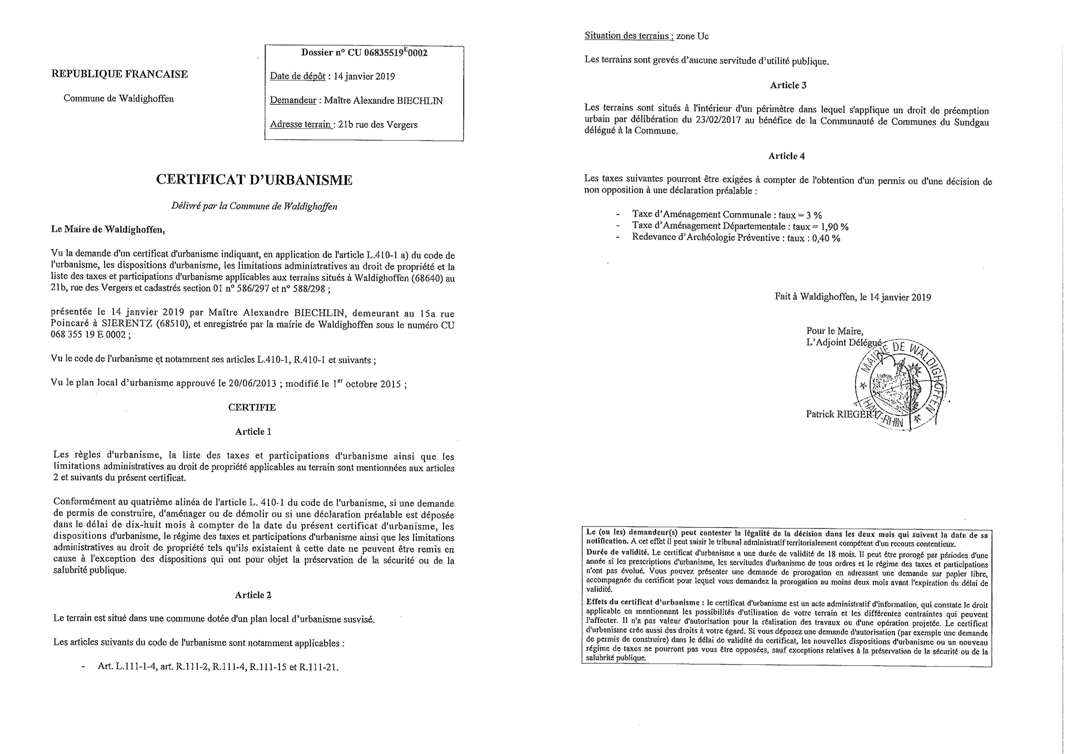 Un certificat d'urbanisme a été établi pour Maître Alexandre Biechlin, concernant une parcelle située au 21b rue des Vergers