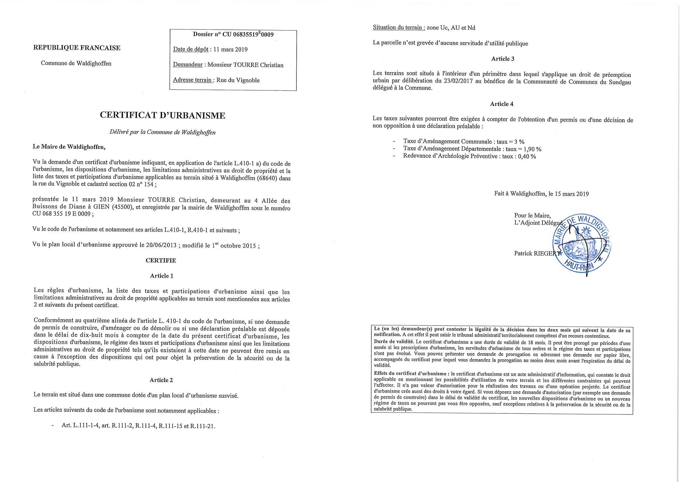 Un certificat d'urbanisme a été établi pour Monsieur Tourre Christian, concernant un terrain situé dans la rue du Vignoble