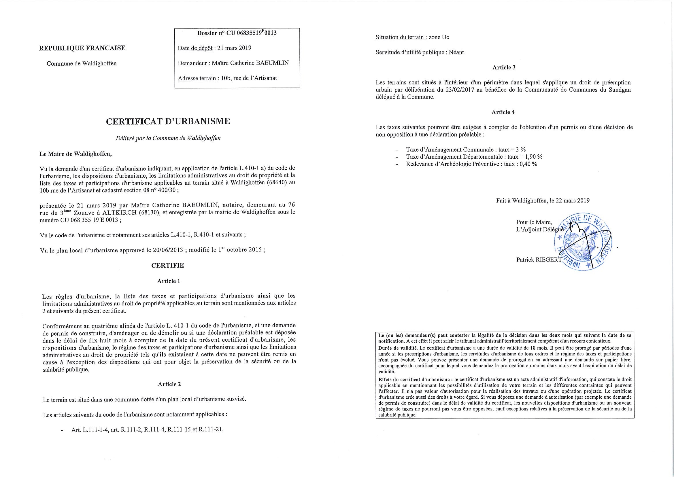 Deux certificats d'urbanisme ont été établis pour Maître Catherine ANDELFINGER, concernant des terrains situés au 10b rue de l'Artisanat