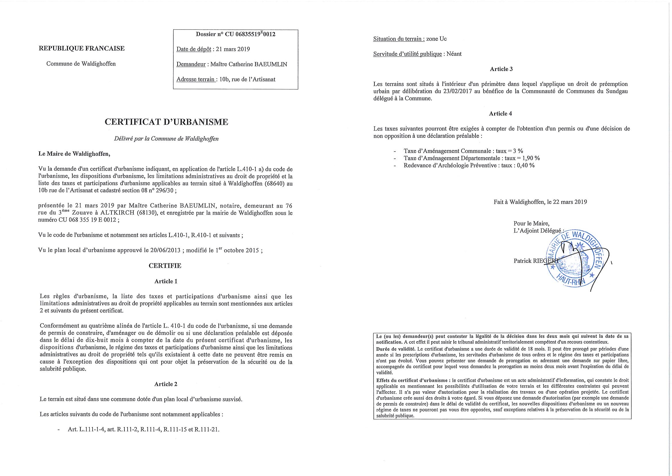 Deux certificats d'urbanisme ont été établis pour Maître Catherine ANDELFINGER, concernant des terrains situés au 10b rue de l'Artisanat