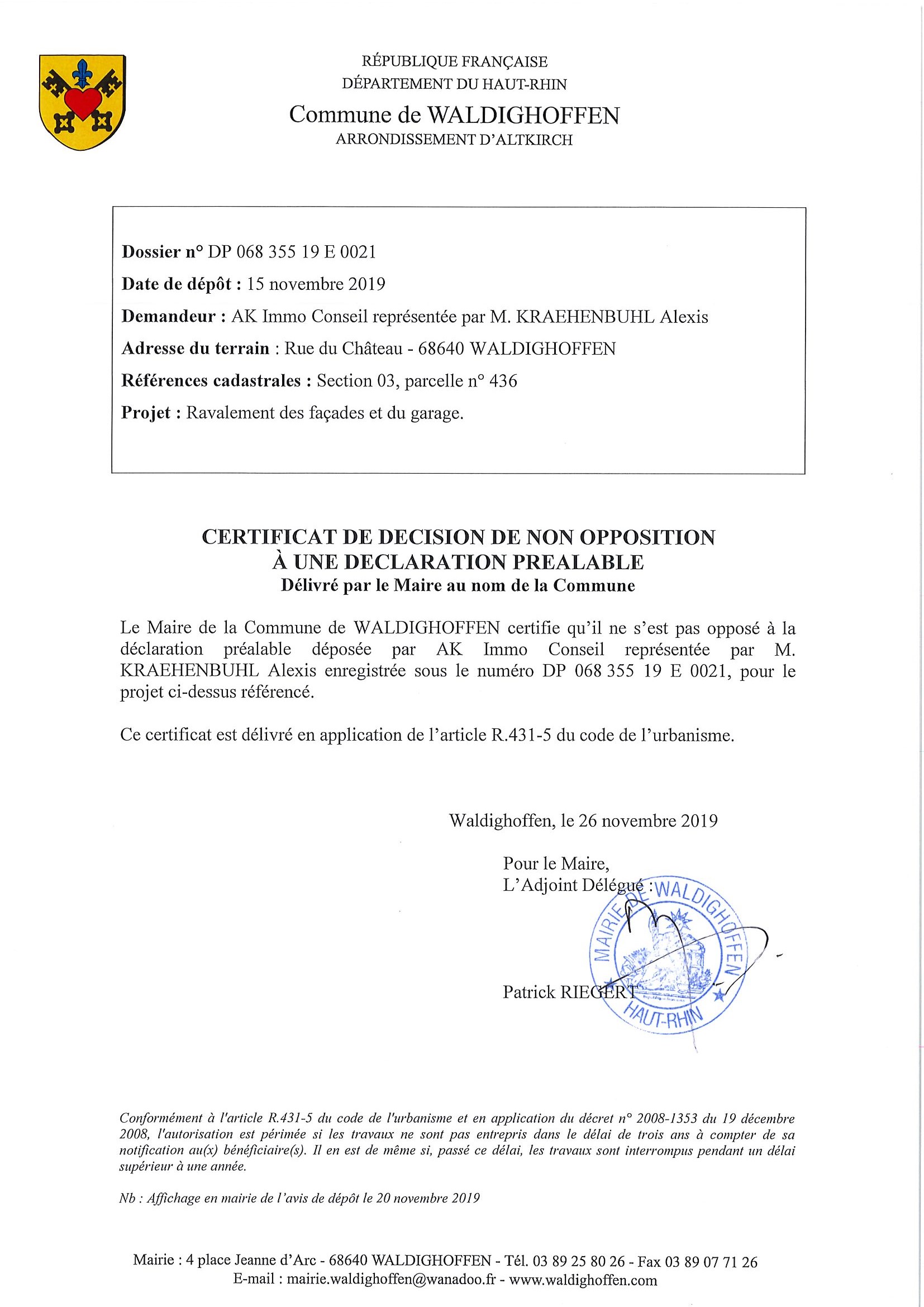 Certificat de non opposition délivré à l'Agence AK Immo conseil représentée par Monsieur Kraehenbuhl Alexis pour des travaux de ravalement de façades