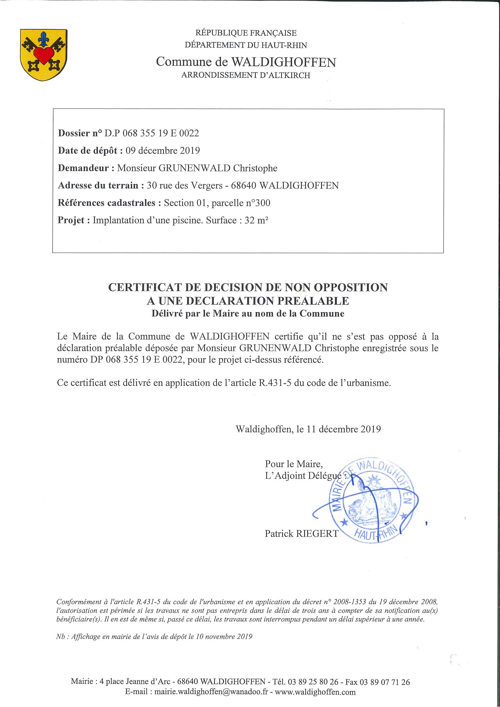 Certificat de non opposition délivré à Monsieur Grunenwald Christophe pour l'implantation d'une piscine