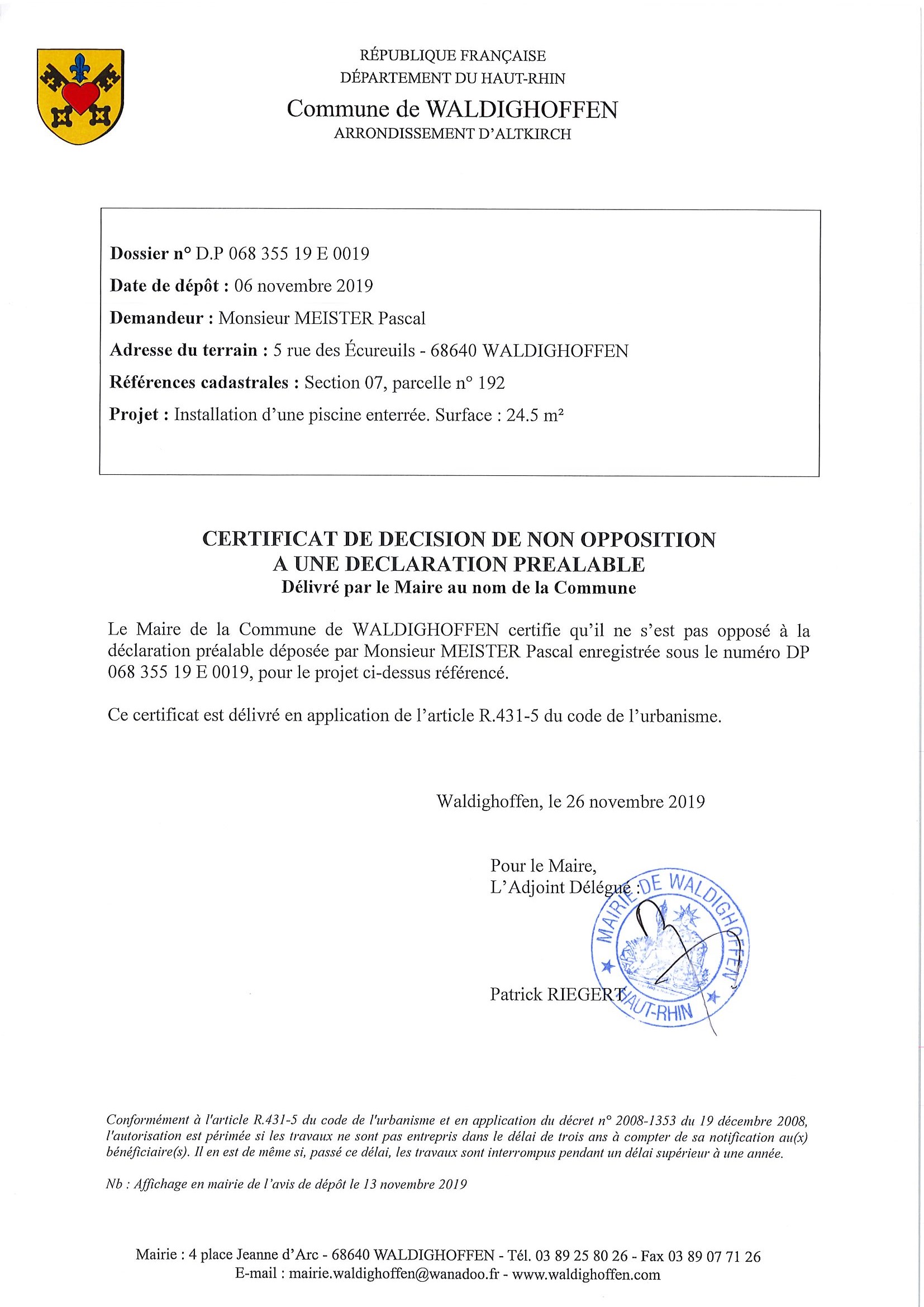 Certificat de non opposition délivré à Monsieur Meister Pascal pour l'installation d'une piscine enterrée.