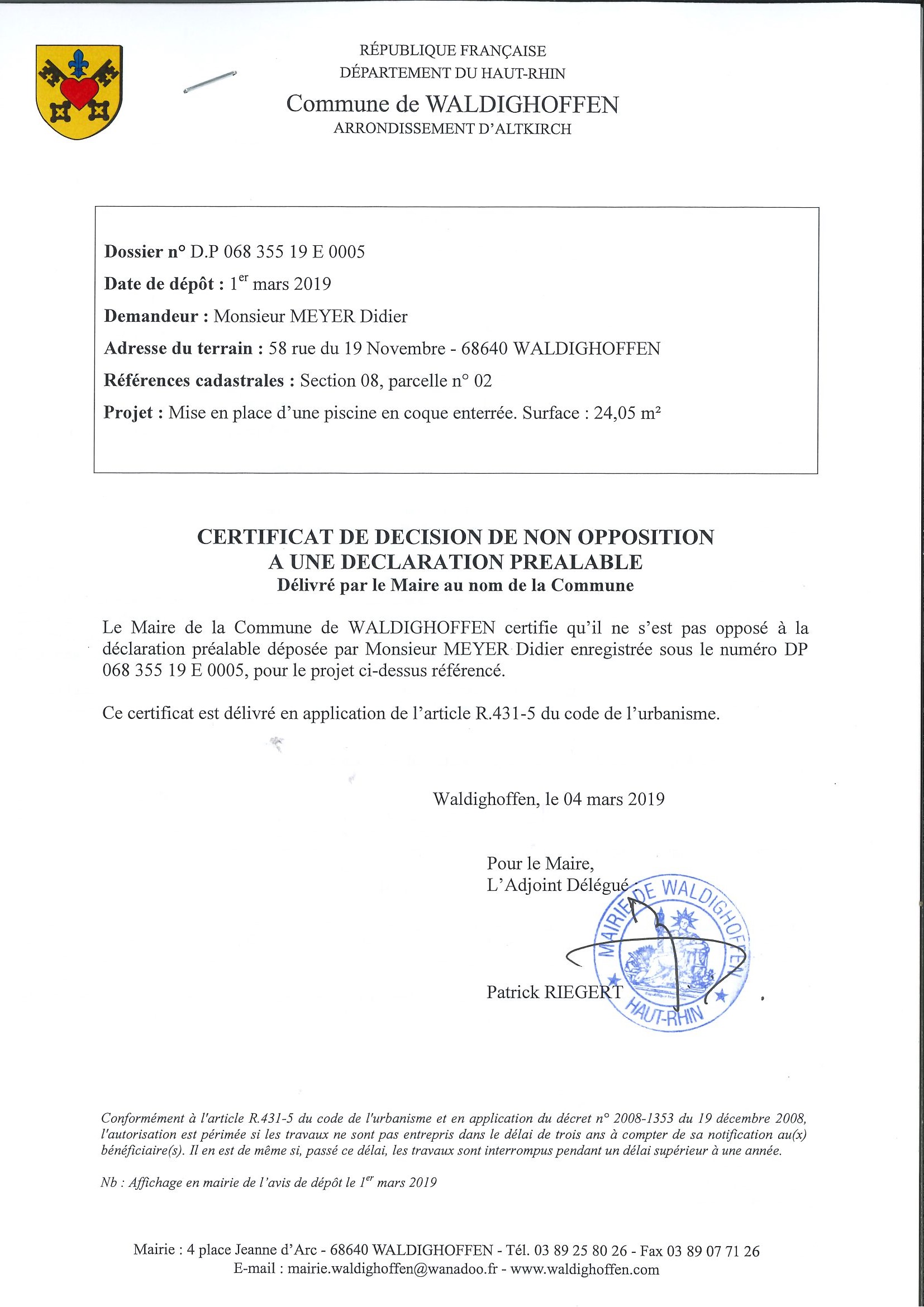 Certificat de non opposition délivré à Monsieur Meyer Didier pour la mise en place d'une piscine enterrée