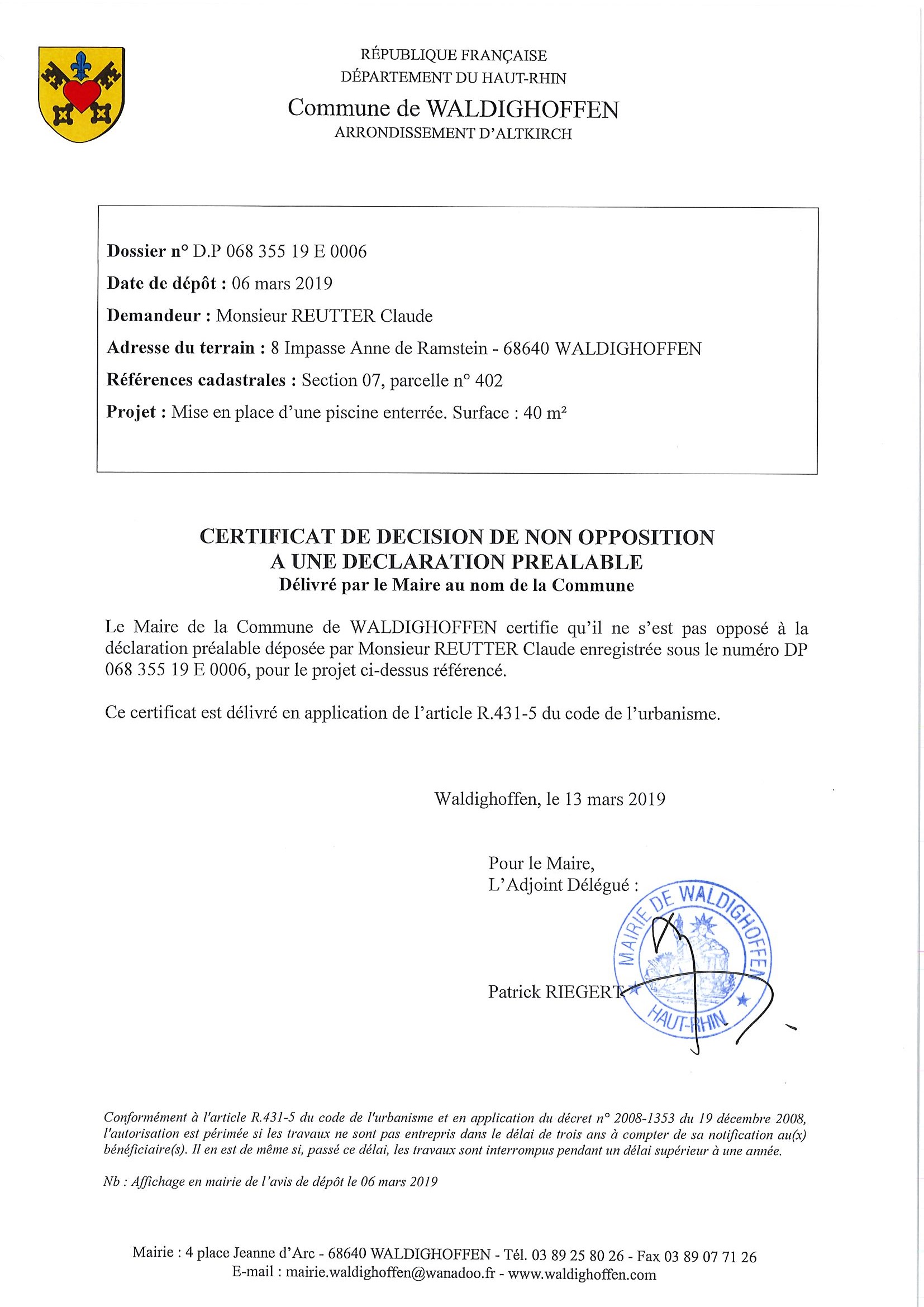 Certificat de non opposition délivré à Monsieur Reutter Claude pour la mise en place d'une piscine enterrée
