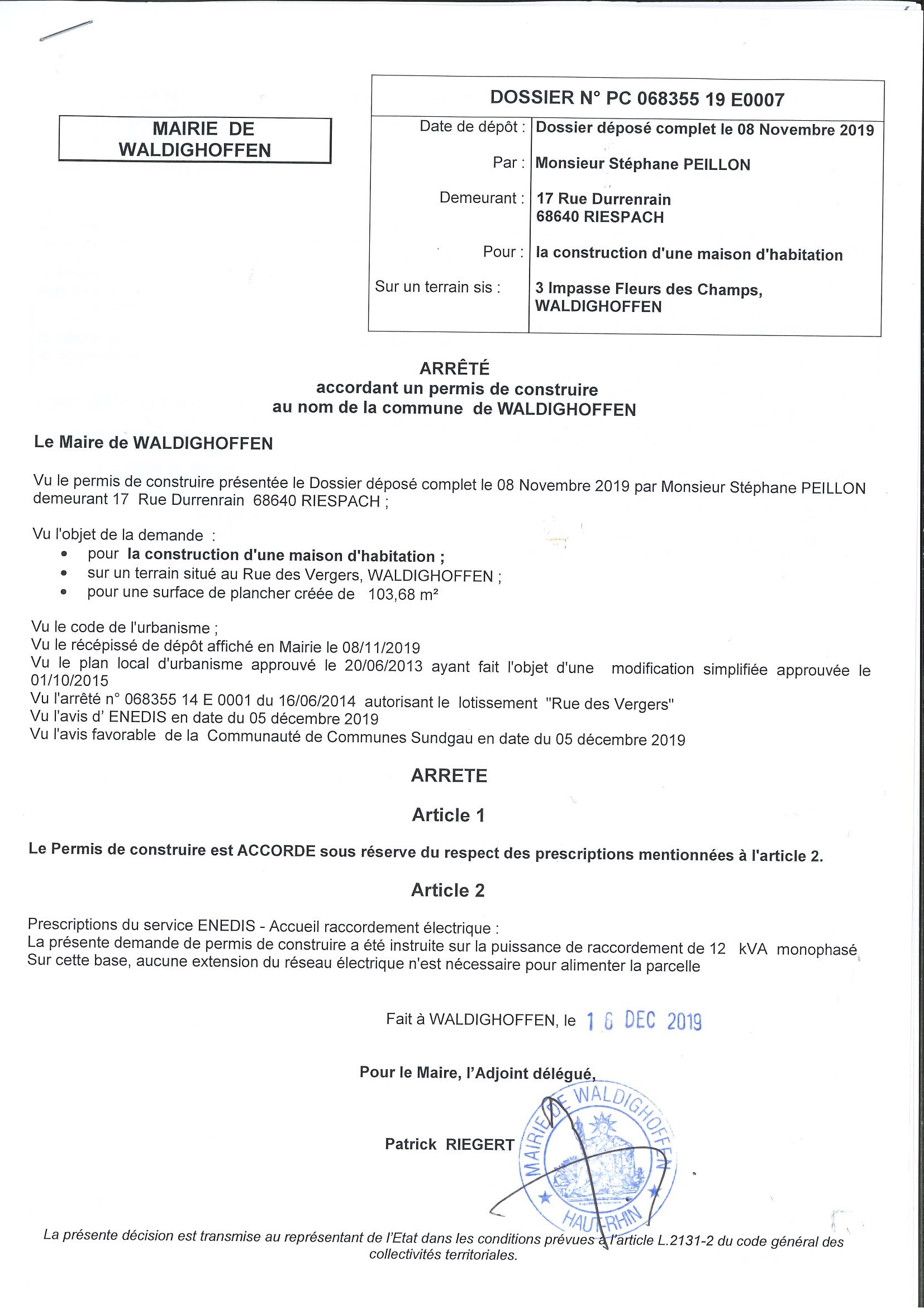 Vous êtes ici : Accueil Mairie Affichage public Annexes affichage public 2019 Décision à la demande de construire de M. Peillon Stéphane