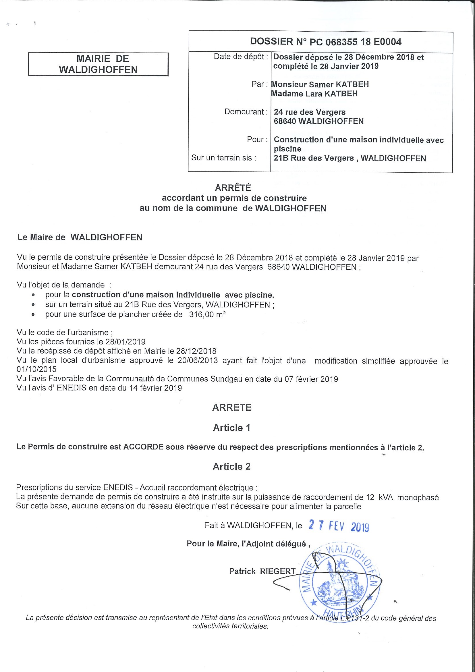 Décision à la demande de construire de Monsieur et Madame Katbeh