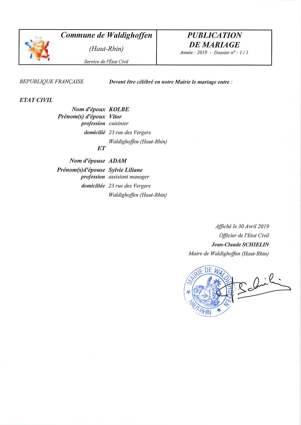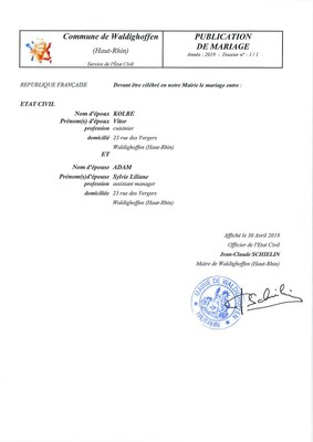 Vous êtes ici : Accueil Mairie Affichage public Annexes affichage public 2019 Mariage KOLBE ADAM