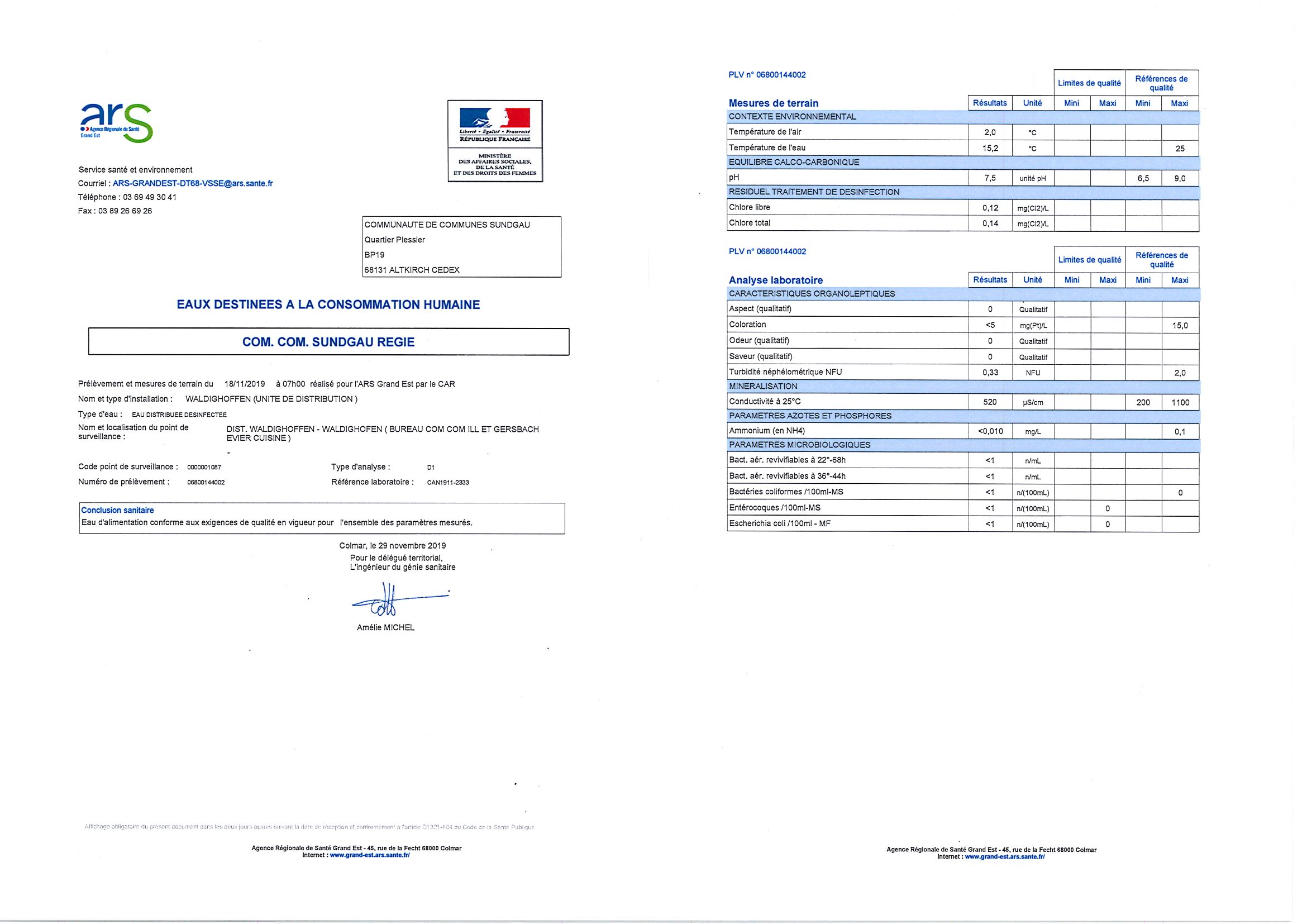 Copie du rapport d'analyse de l'eau potable de Waldighoffen. Prélèvement effectué le 18 novembre 2019