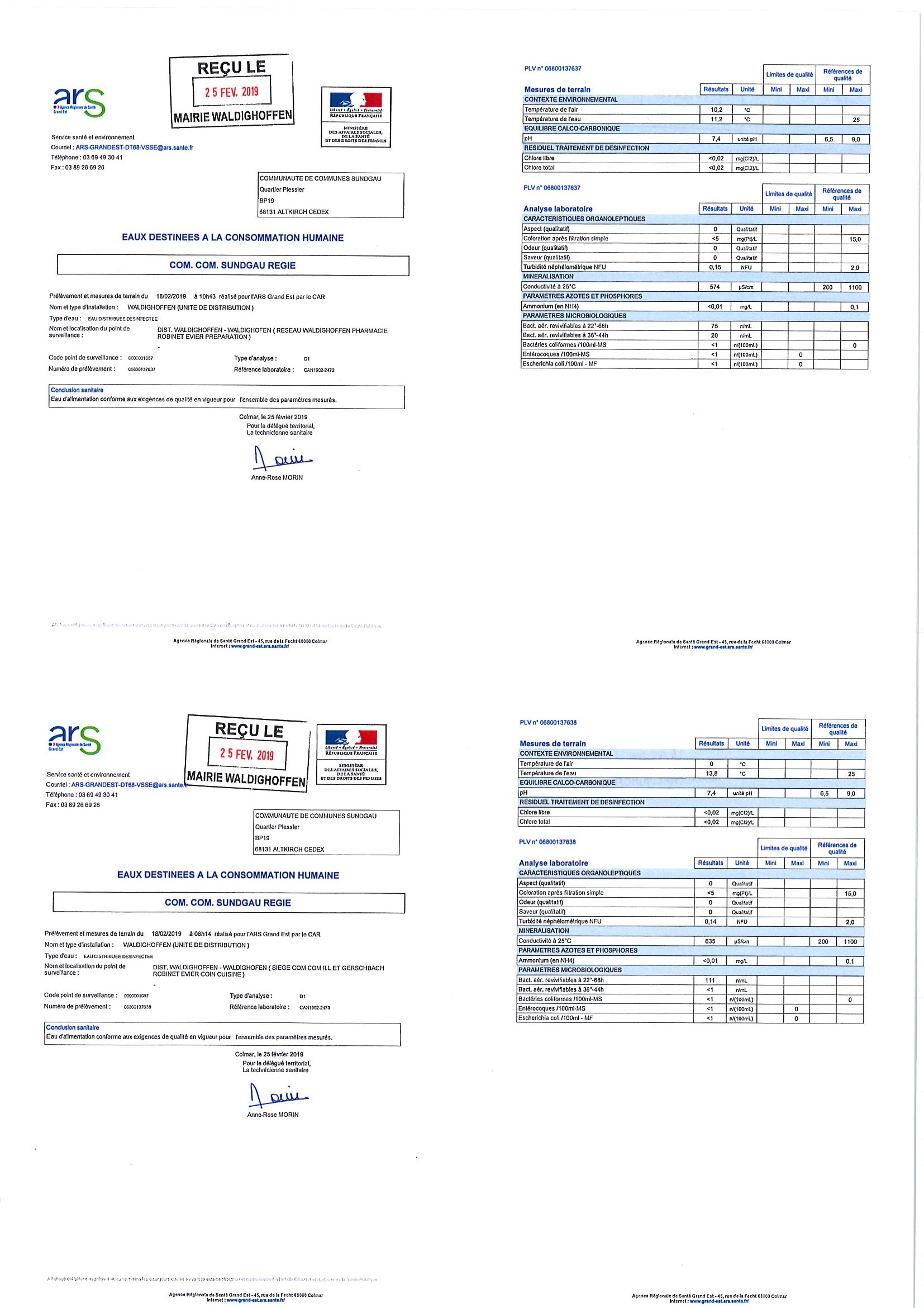 Copie des rapports d'analyse de l'eau potable de Waldighoffen. Prélèvements effectués le 18 février 2019