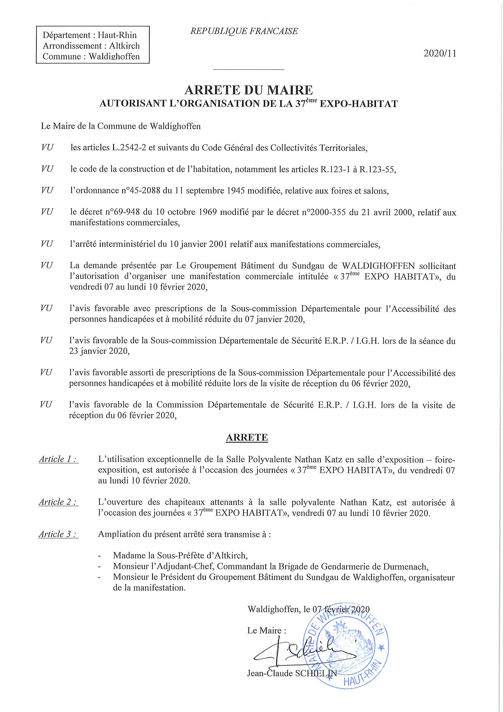 Vous êtes ici : Accueil Mairie Affichage public Annexes affichage public 2020 Arrêté autorisant l'organisation de l'expo-habitat