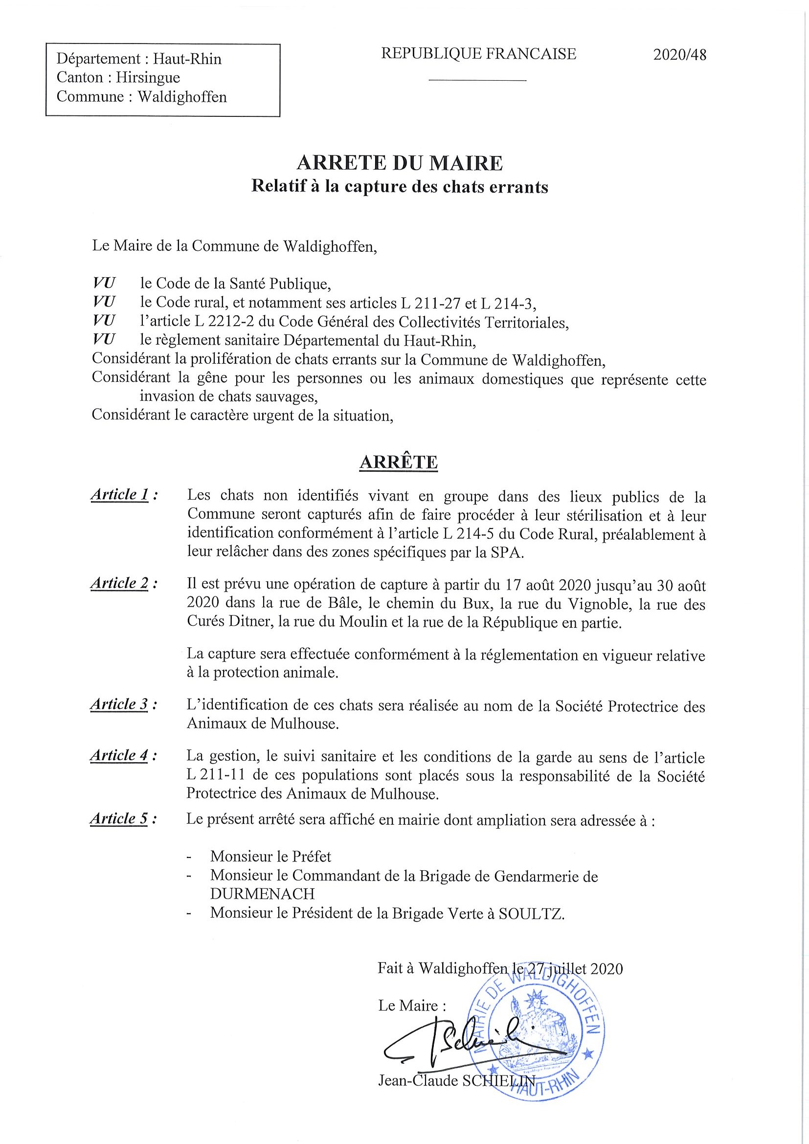 Vous êtes ici : Accueil Mairie Affichage public Annexes affichage public 2020 Arrêté - capture chats errants