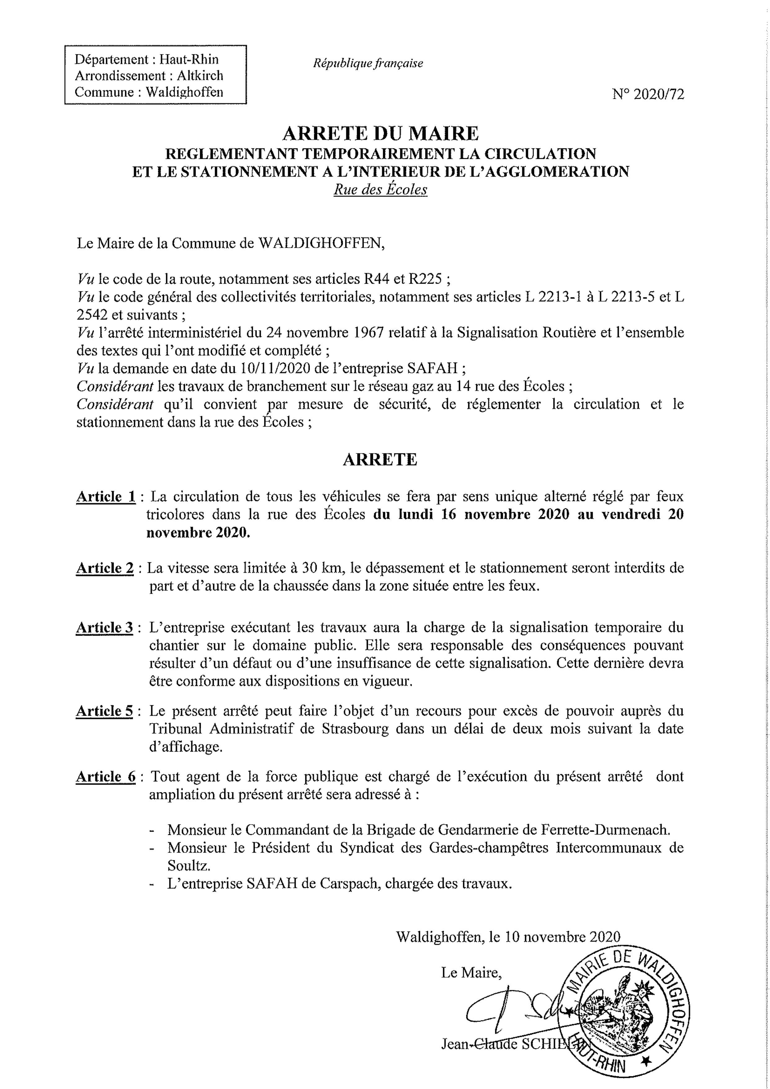 Vous êtes ici : Accueil Mairie Affichage public Annexes affichage public 2020 Arrêté - circulation rue des écoles