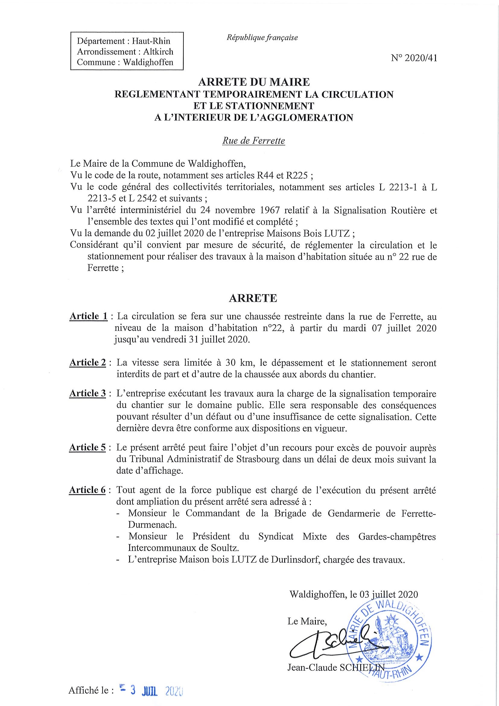 Vous êtes ici : Accueil Mairie Affichage public Annexes affichage public 2020 Arrêté de circulation - rue de Ferrette