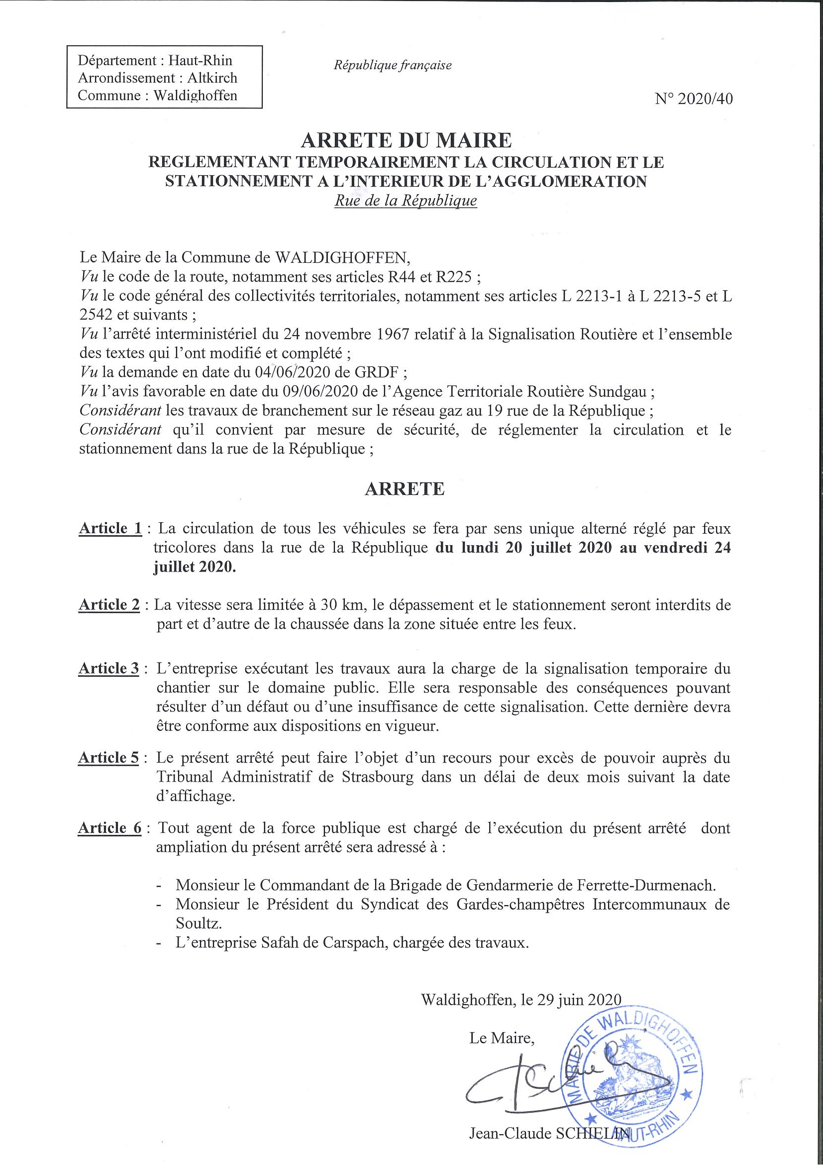 Vous êtes ici : Accueil Mairie Affichage public Annexes affichage public 2020 Arrêté de circulation - rue de la République