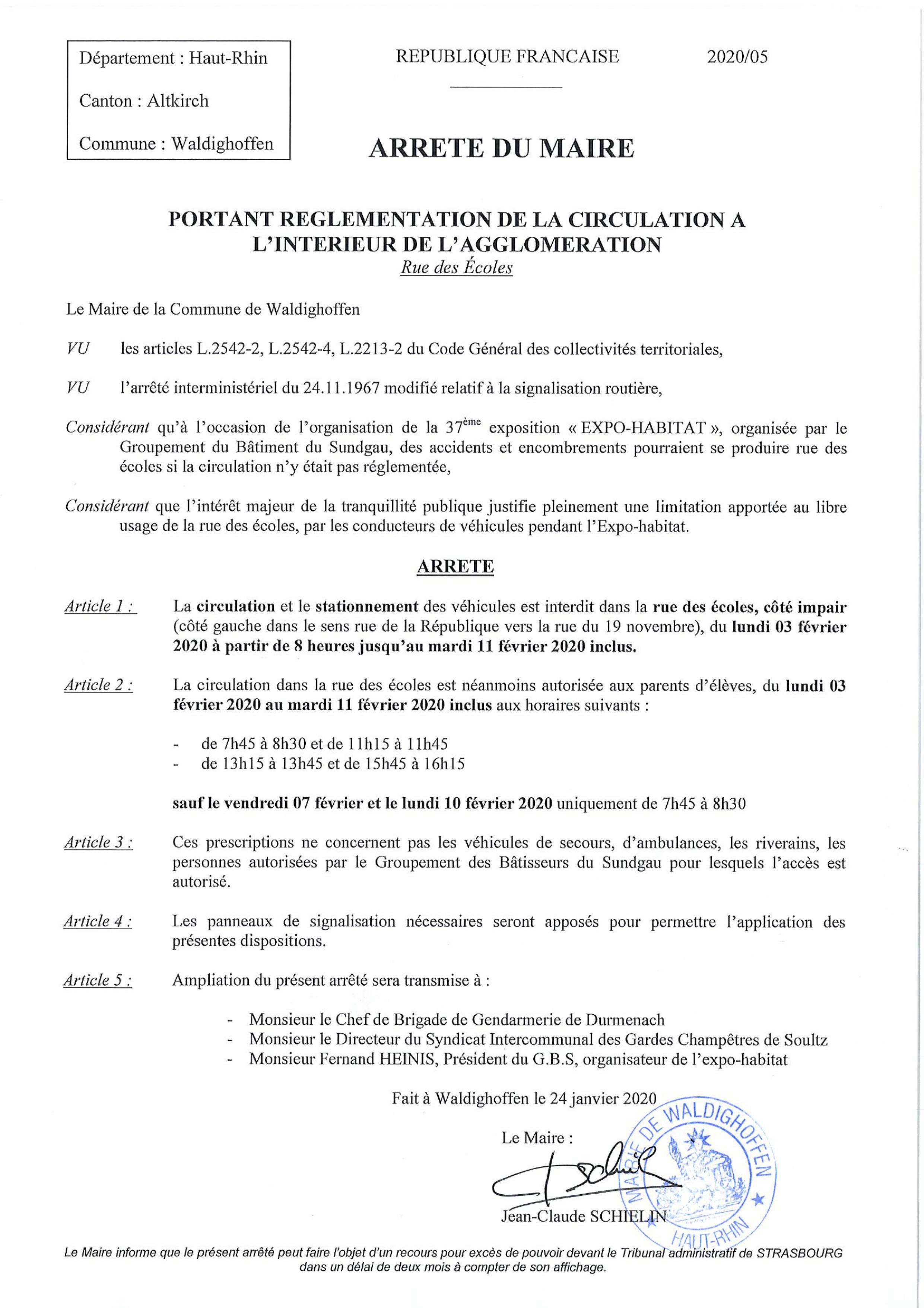 Arrêté du Maire réglementant la circulation dans la rue des Ecoles à l'occasion de l'expo-habitat